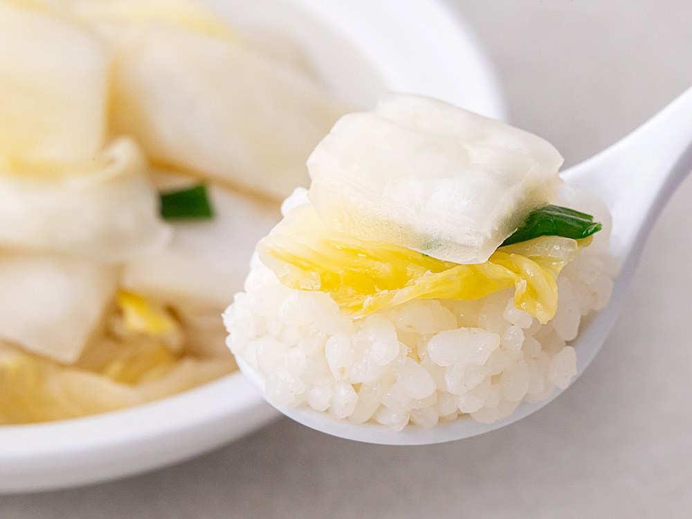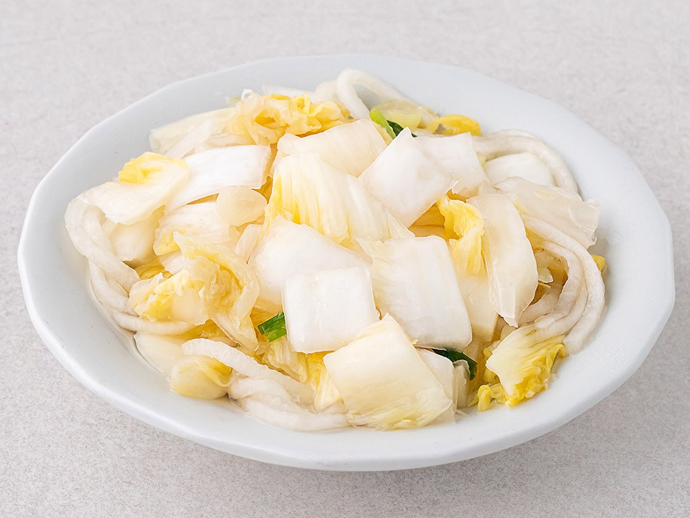 아이들이 먹기 좋게 자른 한입 백김치를 소개할게요. 순한 마늘, 순한 양파를 사용해 매운맛을 줄였어요. 달큼한 매실농축액과 배퓨레가 달짝지근한 감칠맛을 더해준답니다.