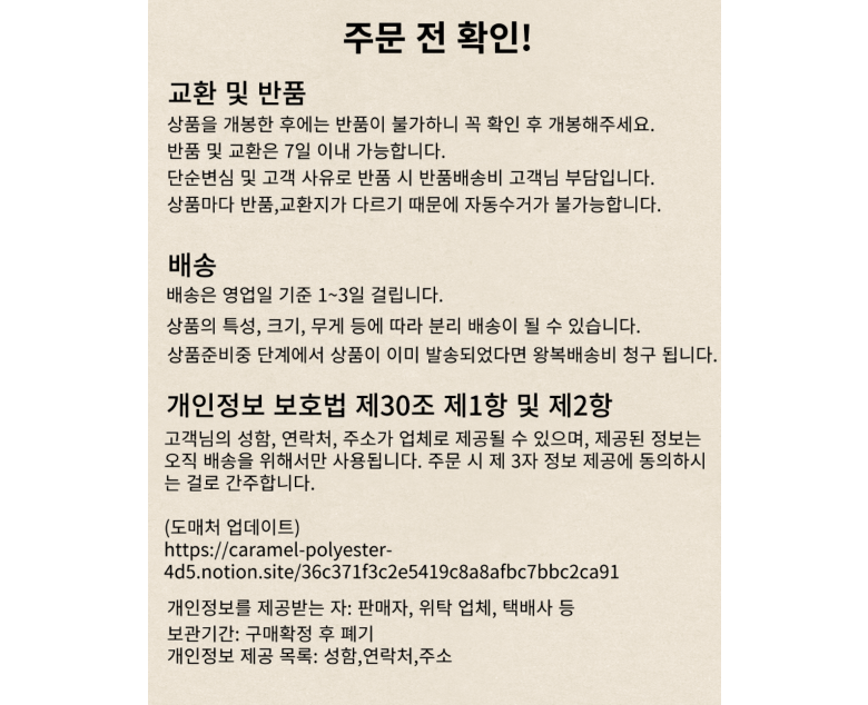 | 교환/반품 비용 (왕복비용) | 5,000원 - 단, 고객 변심의 경우에만 발생 - 도서산간 지역 배송불가 |