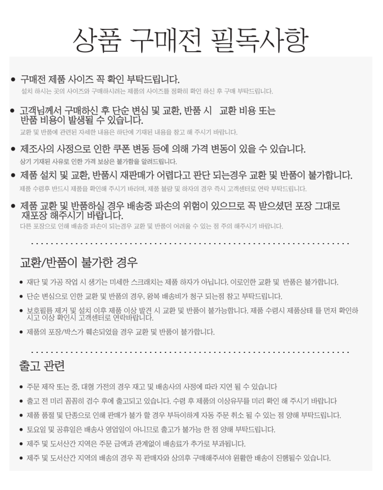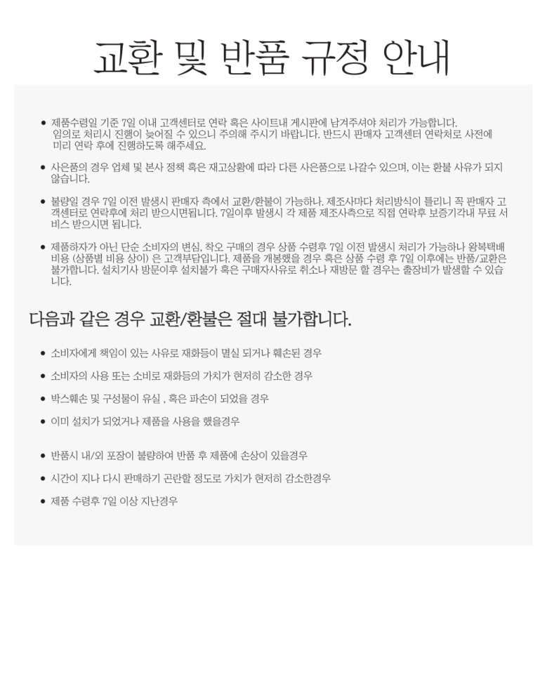 - ㆍ교환/반품에 관한 일반적인 사항은 판매자가 제시사항보다 관계법령이 우선합니다.