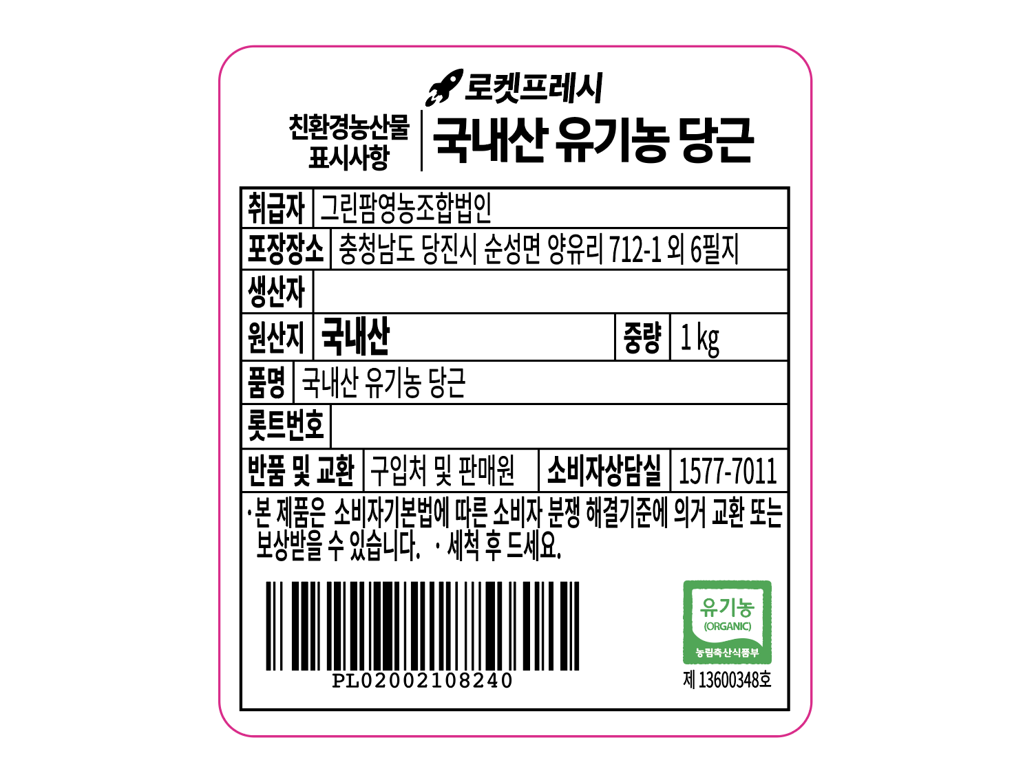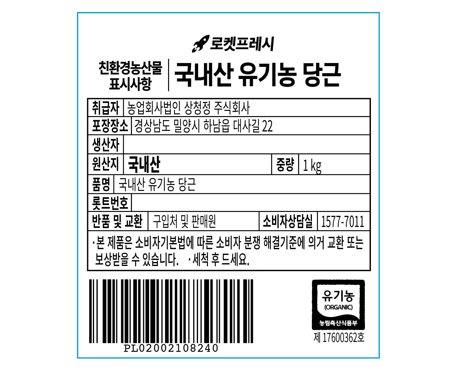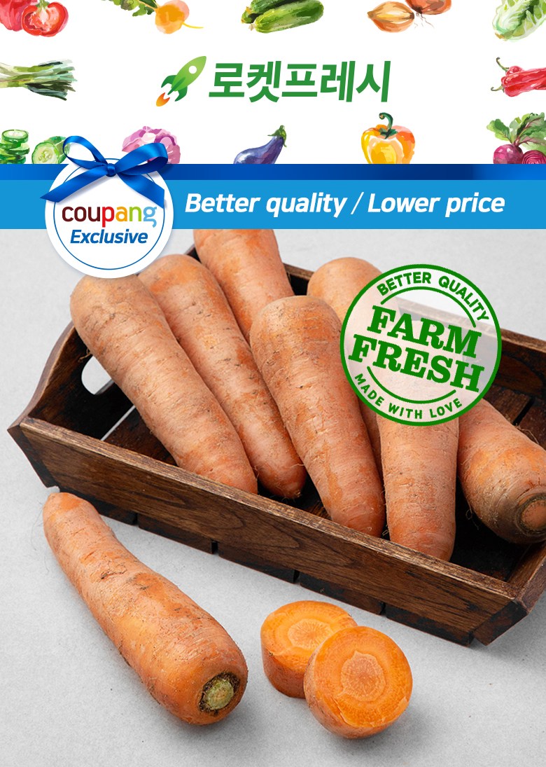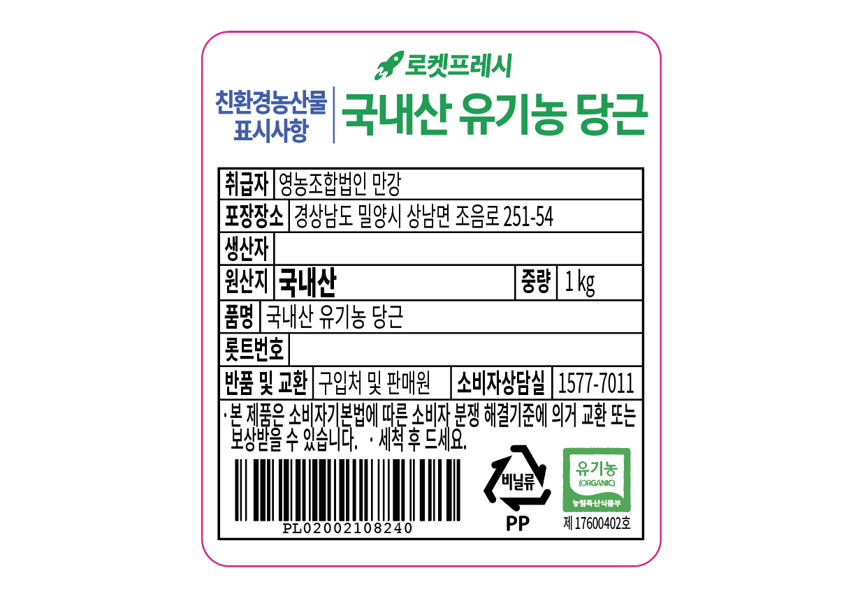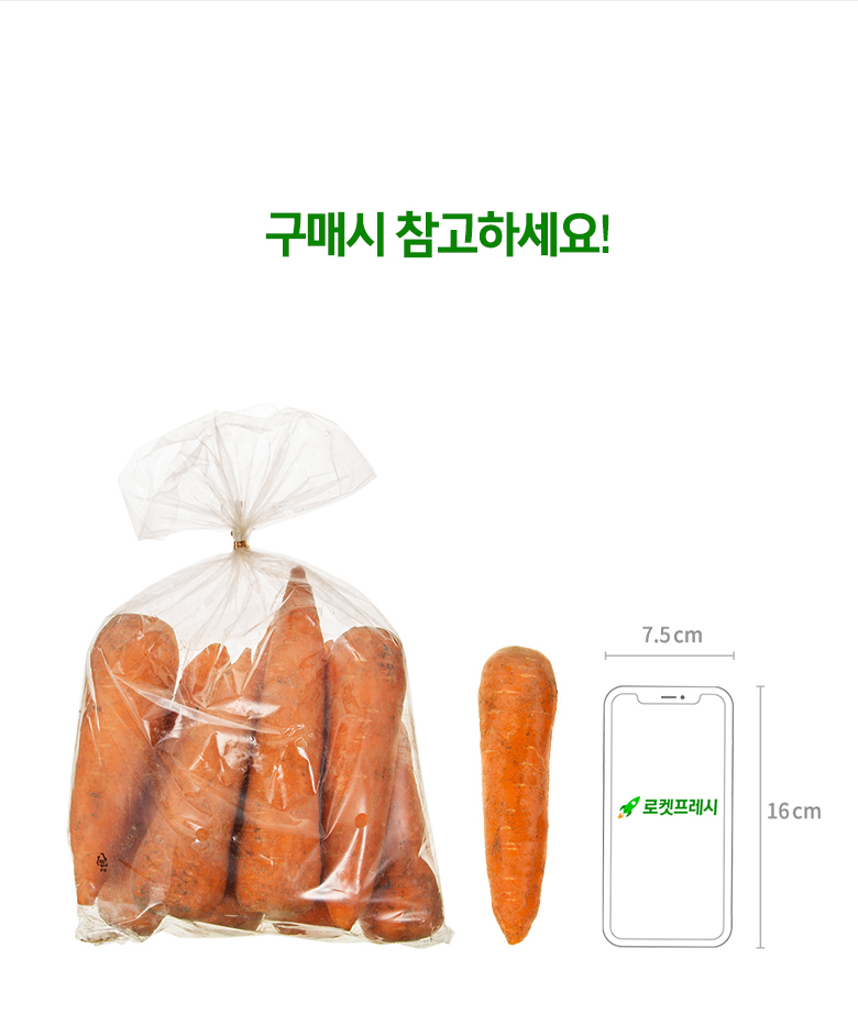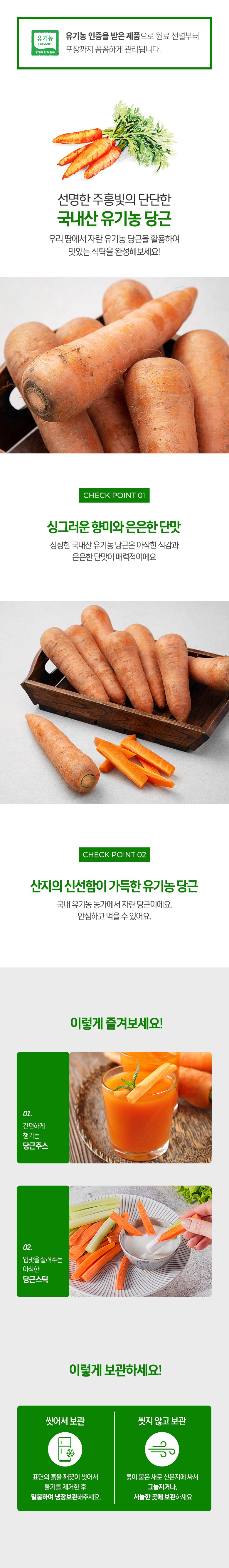 | 품목 또는 명칭 | 국내산 유기농 당근 | 포장단위별 내용물의 용량(중량),수량,크기 | 1개 / 1kg, 신선 식품이므로 수량과 크기는 상이할 수 있습니다. |