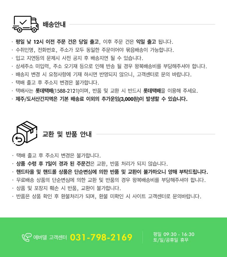 - ㆍ모니터 해상도의 차이로 인해 색상이나 이미지가 실제와 달라, 고객이 단순 변심으로 교환/반품을 무료로 요청하는 경우