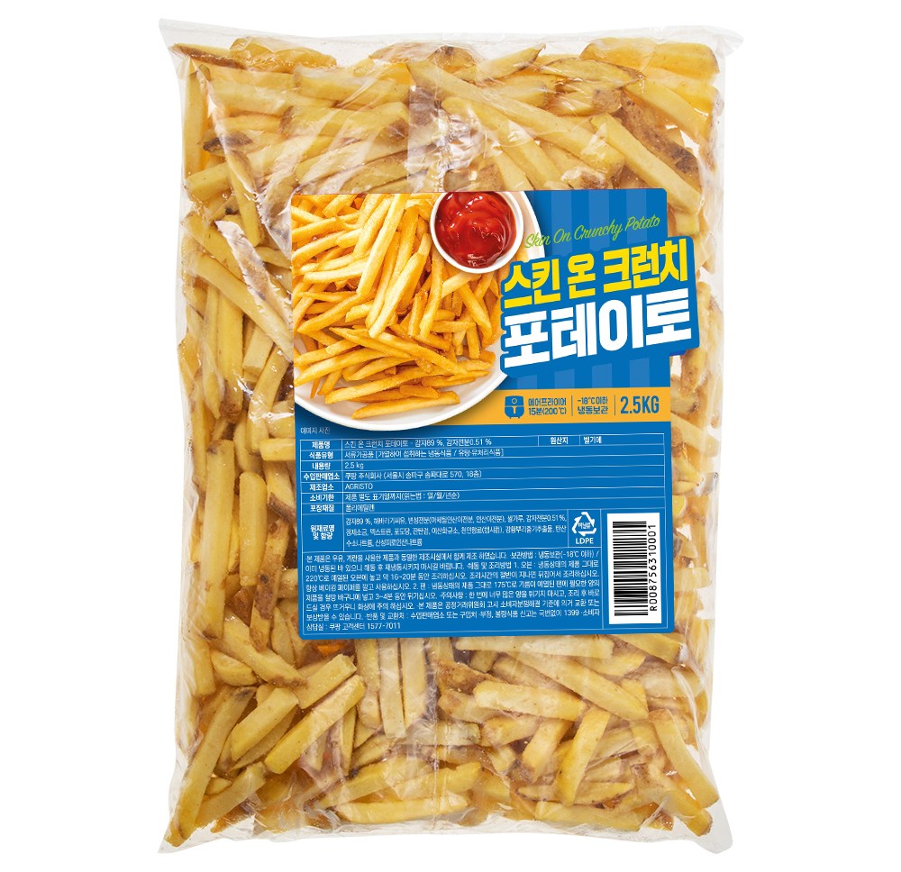 일상에 맛있는 즐거움을 더해줄 감자튀김이에요. 담백한 감자를 먹기 좋은 크기와 길이로 썰고 바삭하게 튀겨냈지요. 노릇노릇하게 한 번 더 조리해주면 포슬포슬하면서도 부드러운 식감, 고소하고 짭조름한 풍미를 오롯이 즐기실 수 있답니다.