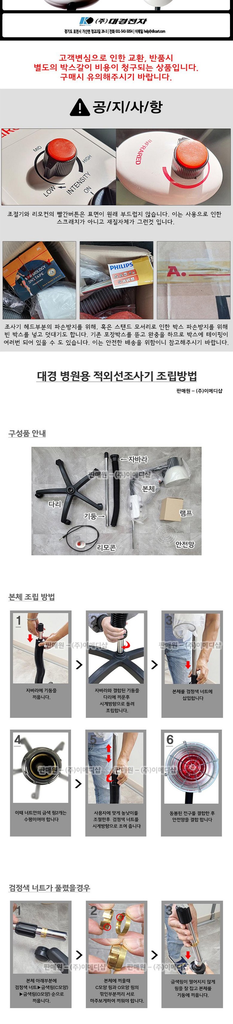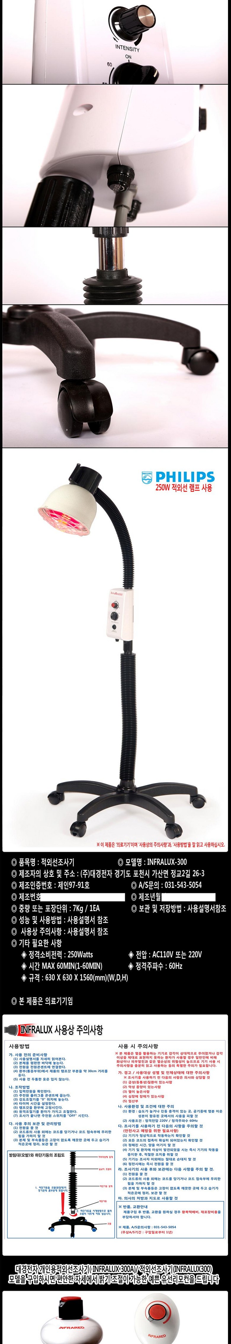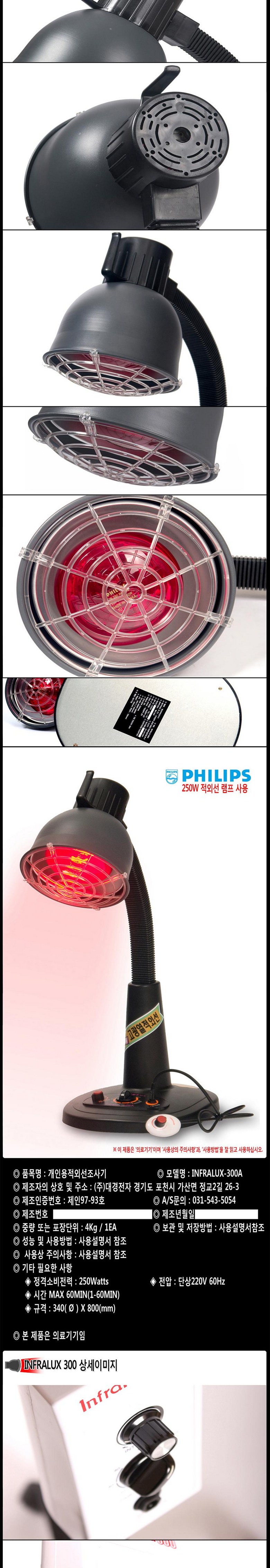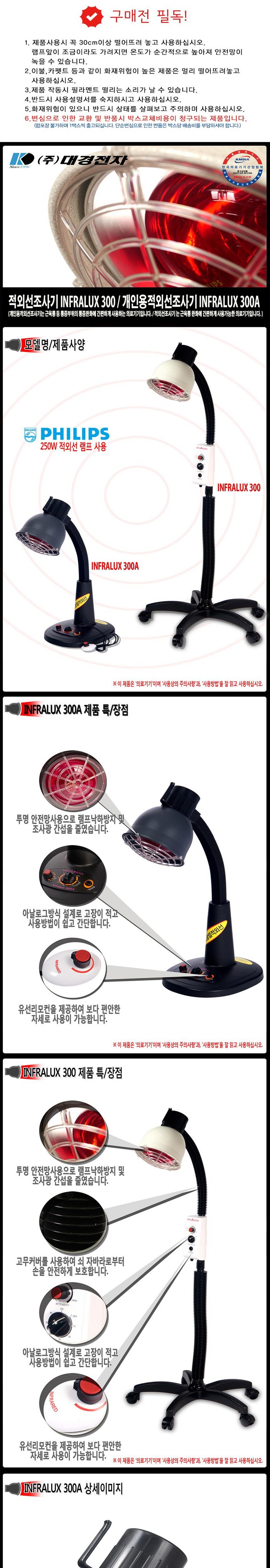 | 품명 및 모델명 | 대경 개인용 적외선조사기 INFRALUX-300A | 허가∙인증∙신고번호 (의료기기법에 따른 허가∙인증∙신고 대상 의료기기에 한함) | 품목허가번호 : 제허 97-93호심의면제접수번호 : 2015-00259 |