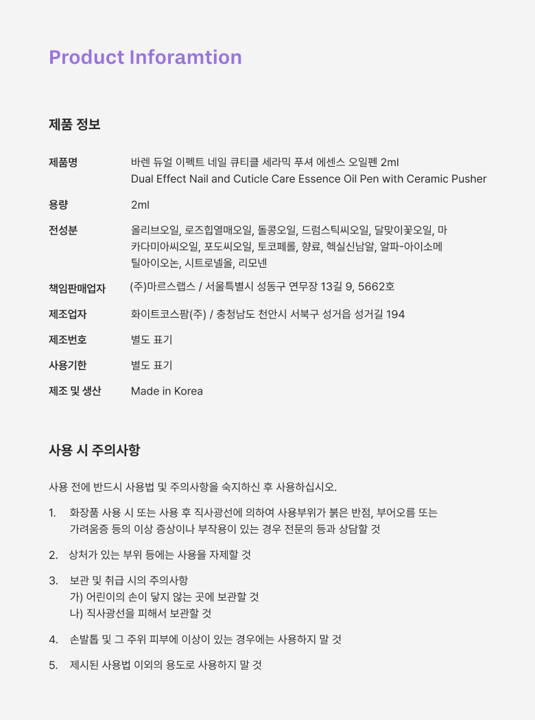 | 화장품제조업자, 화장품책임판매업자 및 맞춤형화장품판매업자 | 컨텐츠 참조 | 제조국 | 대한민국 |