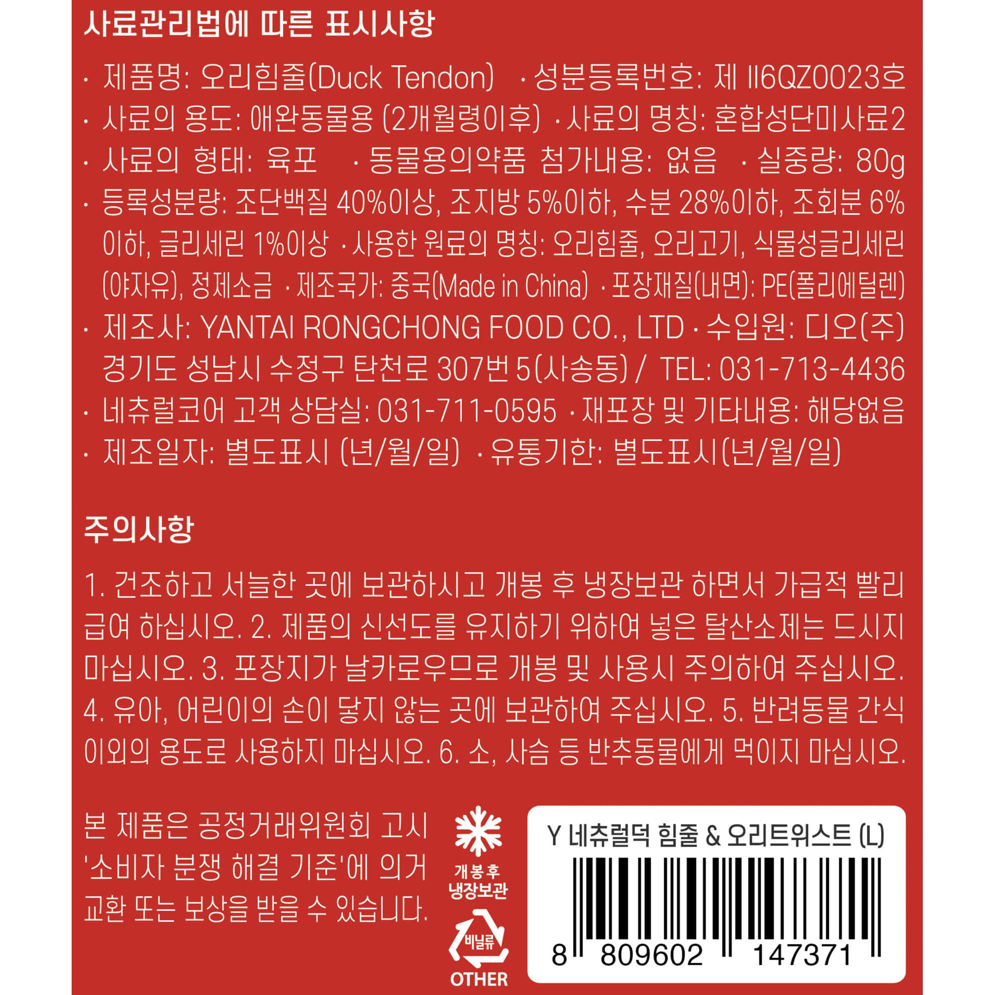 | 품명 및 모델명 | 오리힘줄 (Duck Tendon) | 인증/허가 사항 | 사료관리법에 따른 성분등록번호: 컨텐츠참조 |