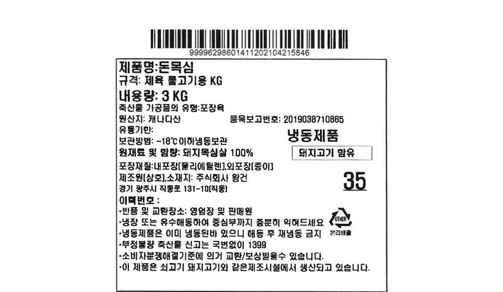 | 품목 또는 명칭 | 돈목심 | 포장단위별 내용물의 용량(중량),수량,크기 | 3kg, 1개, 신선 식품이므로 수량과 크기는 상이할 수 있습니다. |