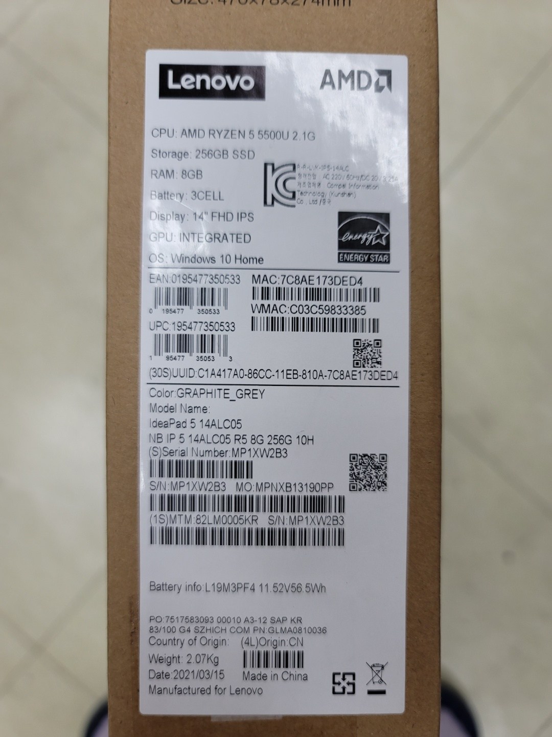 | 품명 및 모델명 | 레노버 2021 아이디어패드 슬림5 82LM0005KR | KC 인증정보 | XU100309-20076A/ R-R-LVK-IP5-14ALC |