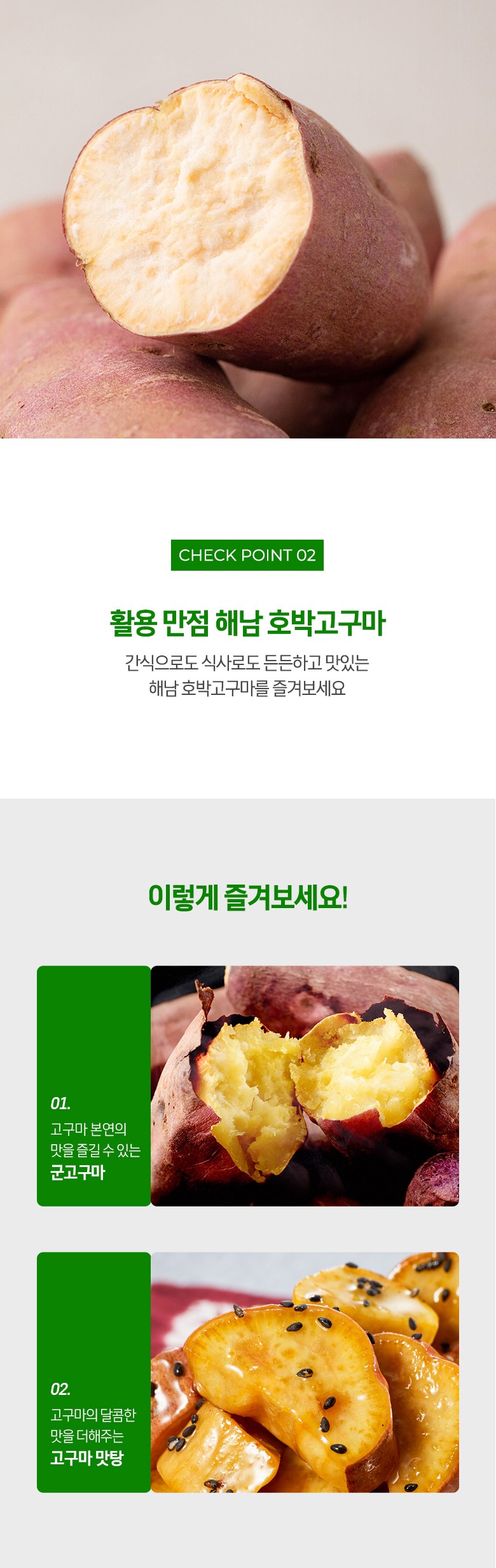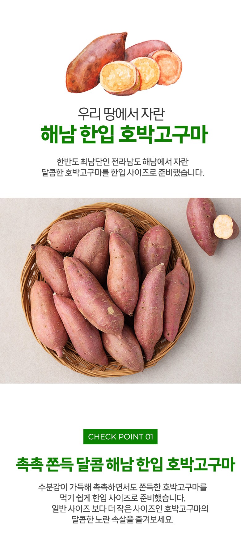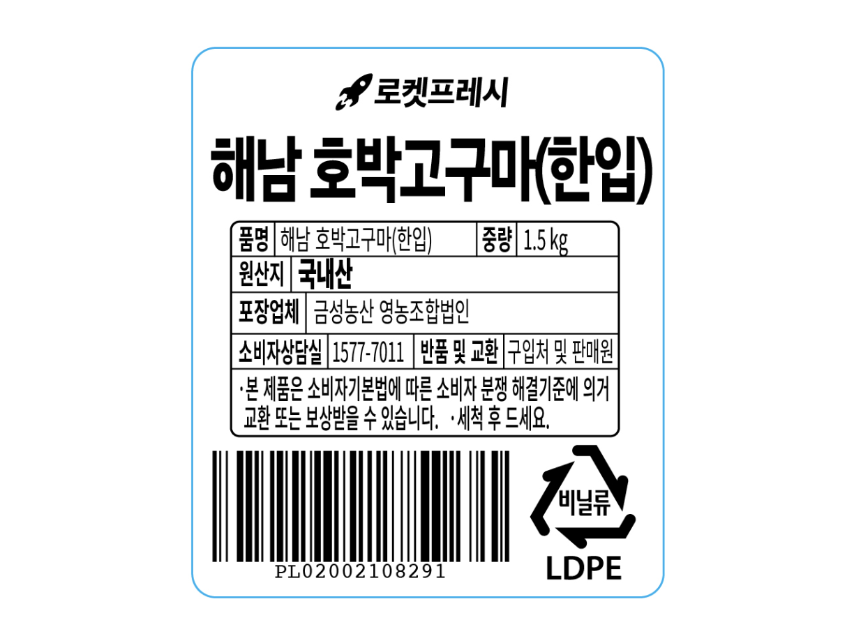 | 품목 또는 명칭 | 해남 호박고구마(한입) | 포장단위별 내용물의 용량(중량),수량,크기 | 1.5kg x 1봉 |