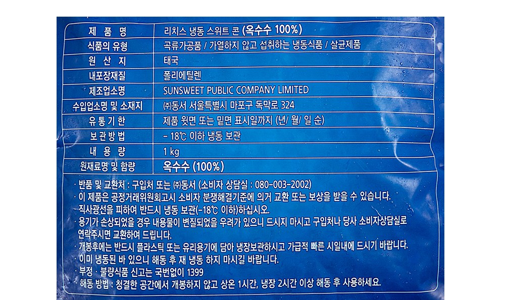 | 제품명 | 리치스 냉동 스위트콘 | 식품의 유형 | 곡류가공품/가열하지 않고 섭취하는 냉동식품/살균제품 |