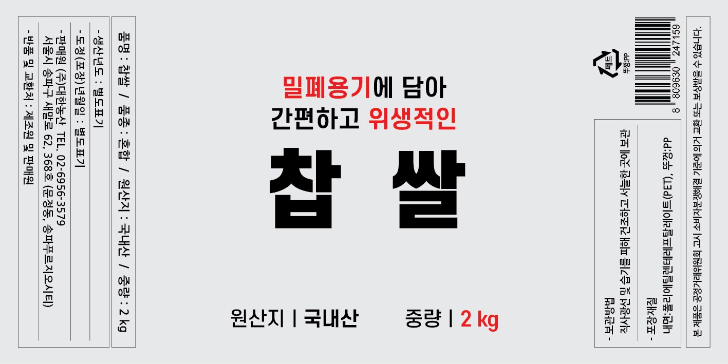| 품목 또는 명칭 | 찹쌀 | 포장단위별 내용물의 용량(중량),수량,크기 | 2kg*2개,1개 |