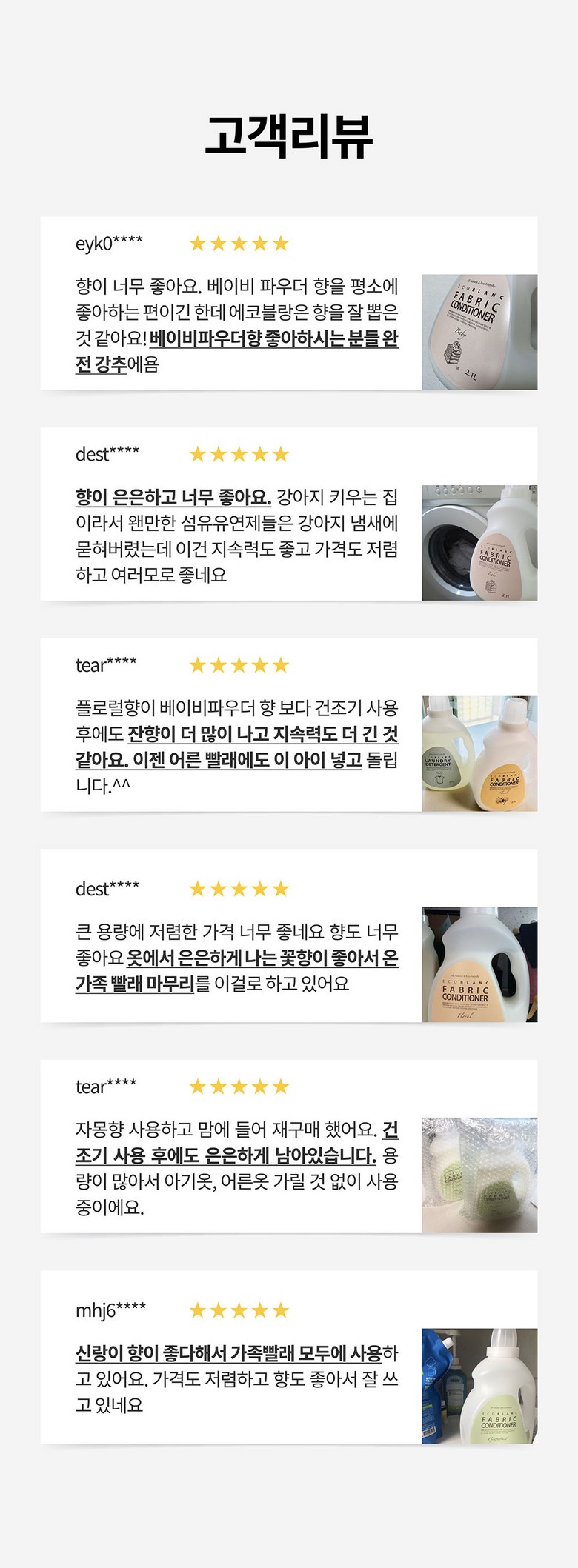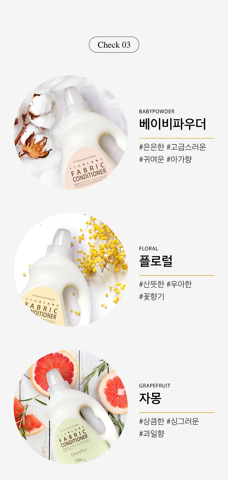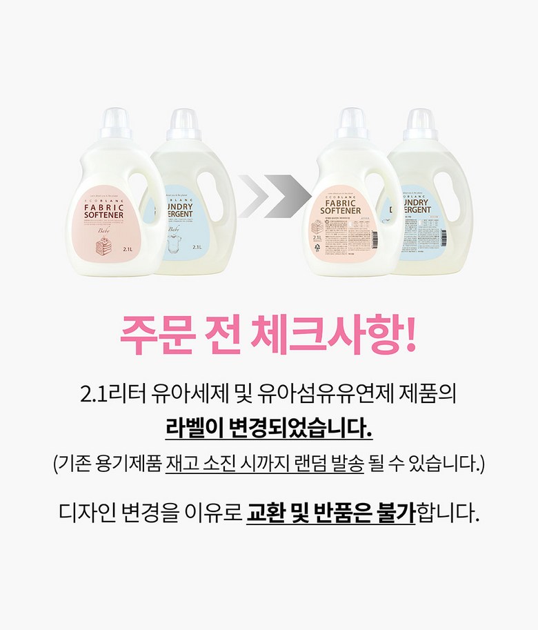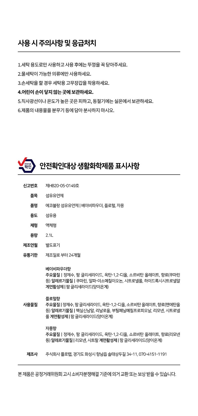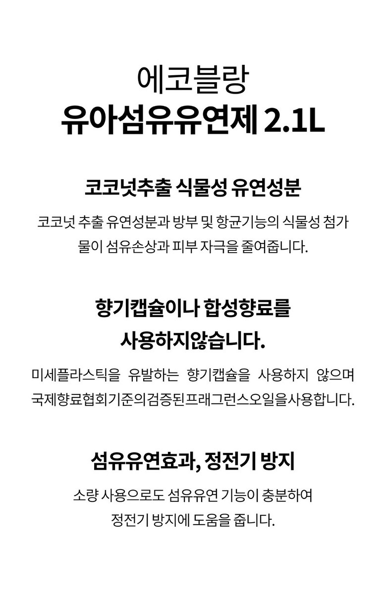 | 품목 및 제품명 | 섬유유연제 / 에코블랑 섬유유연제 | 용도(표백제의 경우 계열을 함께표시) 및 제형 | 섬유용 / 액체형 |