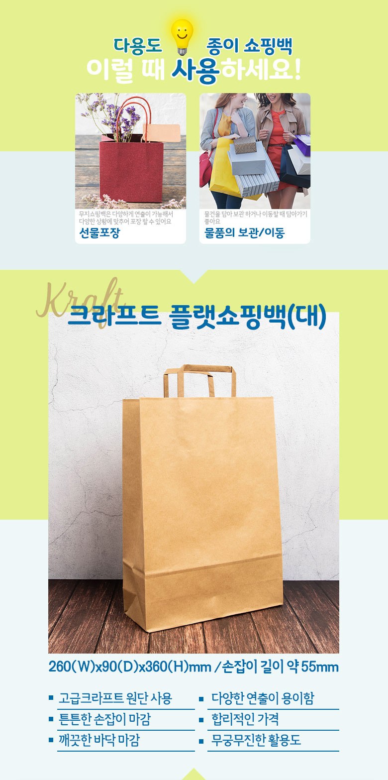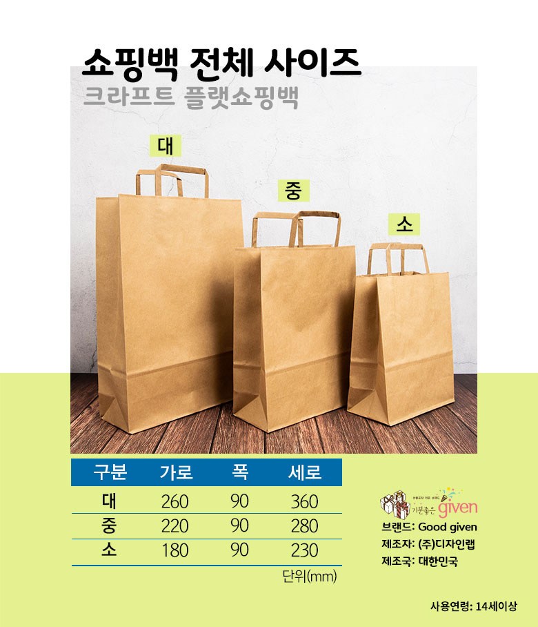 | 품명 및 모델명 | given 크라프트 플랫쇼핑백 3p x 12개 브라운 대(260 x 90 x 360 mm) | 인증/허가 사항 | 해당없음 |