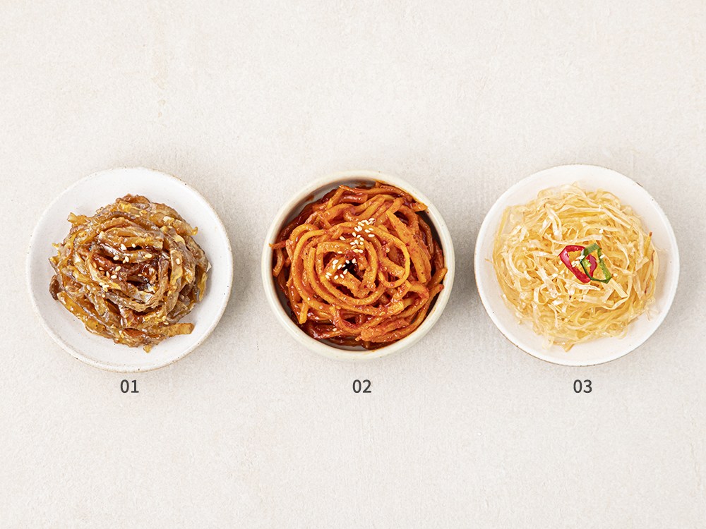 01 쥐포채간장조림 02 진미채 03 오징어채조림