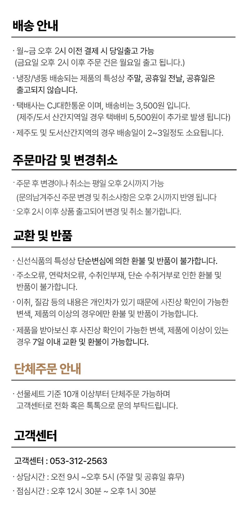 | 교환/반품 비용 (왕복비용) | 3,500원 - 단, 고객 변심의 경우에만 발생 - 도서산간 및 일부 지역 추가비용 발생 |