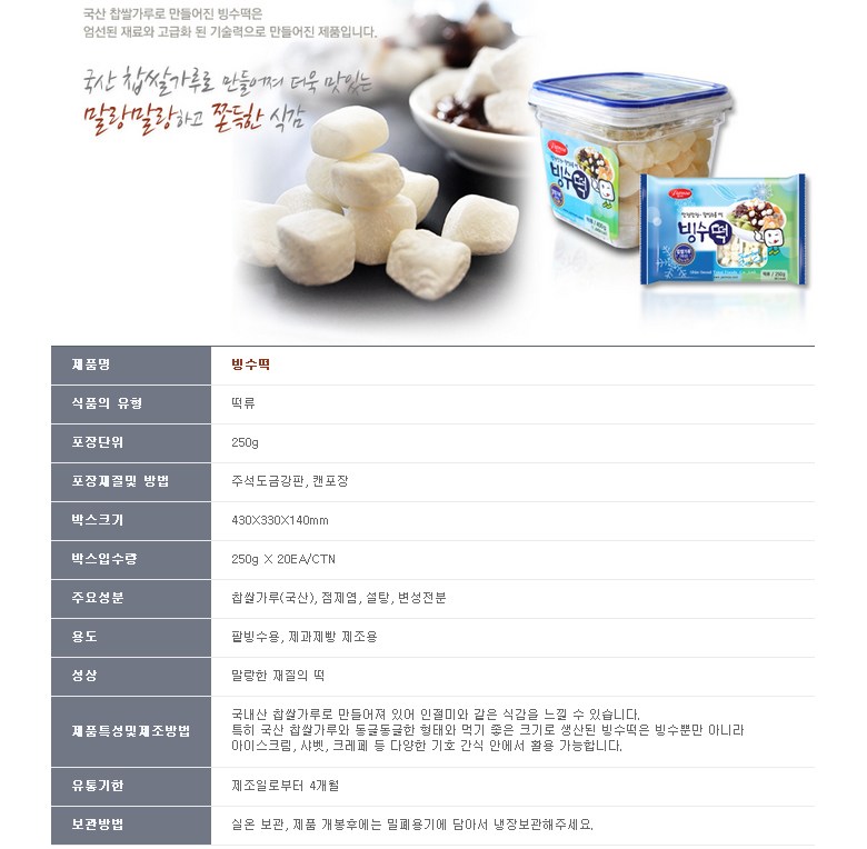 | 제품명 | 팥모아 빙수떡 250g 20개 | 식품의 유형 | 상품 상세페이지 참조 |