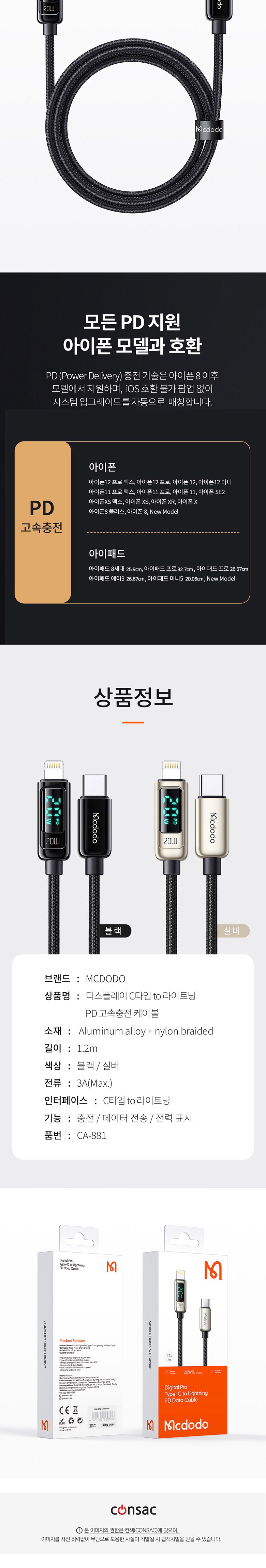 | 품명 및 모델명 | 디스플레이 C타입 to 라이트닝 PD 고속충전 케이블 - 블랙 / CA-8810 | 인증/허가 사항 | 해당없음 |