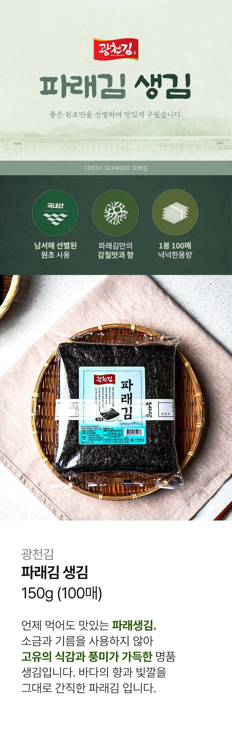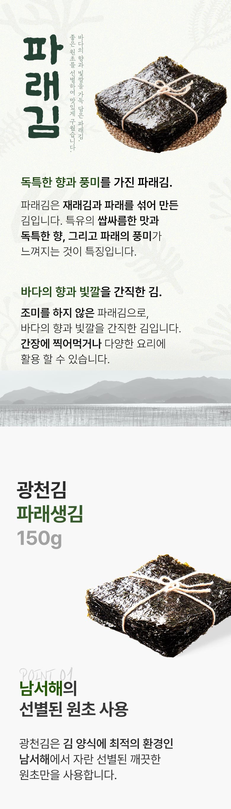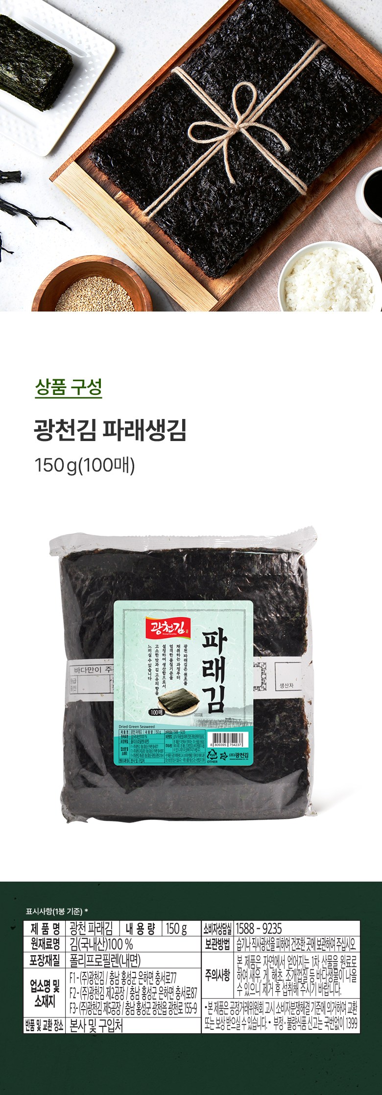 | 품목 또는 명칭 | 광천 파래김 | 포장단위별 내용물의 용량(중량),수량,크기 | 150g*6개 |