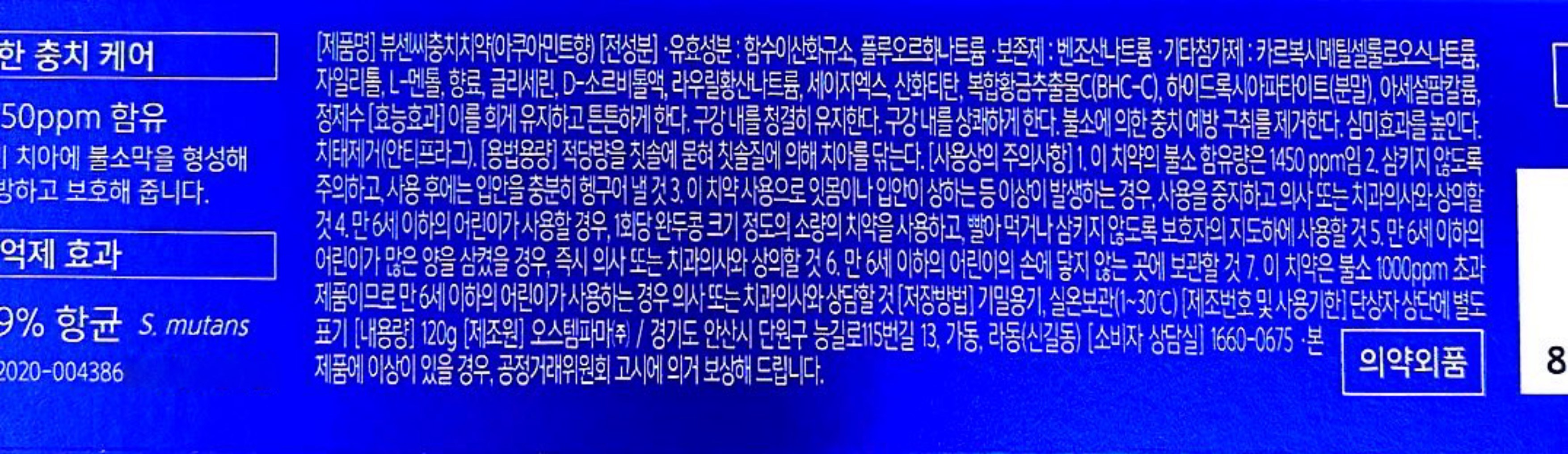 | 품명 및 모델명 | 뷰센씨충치치약(아쿠아민트향) | 인증/허가 사항 | 의약외품 |