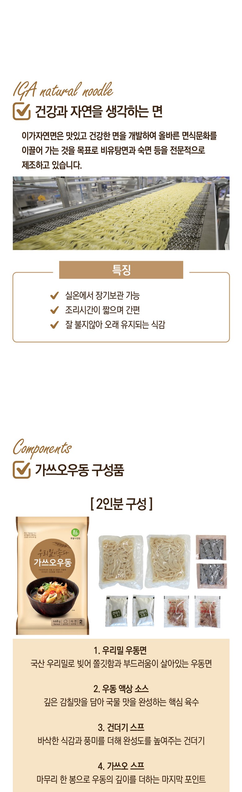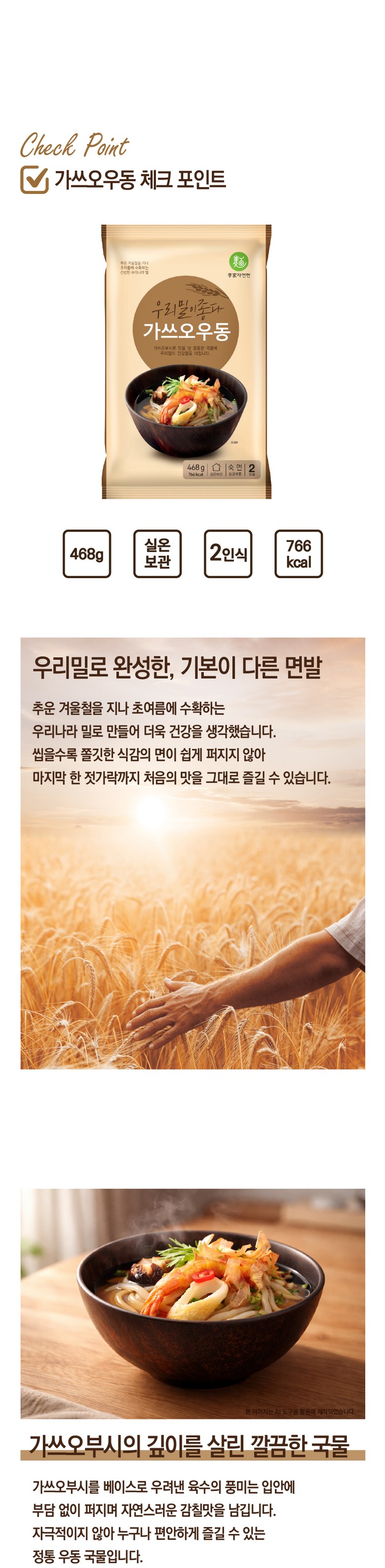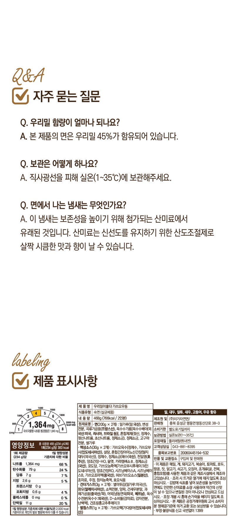 | 포장단위별 내용물의 용량(중량), 수량 | 2인분입 468g | 원재료명 및 함량 | * 면 : 밀가루(밀:국산), 변성전분, 곡류가공품(프랑스산), 옥수수유(옥수수/외국산:러시아, 헝가리, 세르비아 등), 혼합제제(젖산, 젖산나트륨, 정제소금, 정제수), 정제소금, 포도씨유, 고구마전분, 쌀가루* 액상소스 : 가쓰오육수 35.51%{정제수, 가다랑어포2.91%(필리핀산)}, 설탕, 혼합간장{아미노산간장(탈지대두:인도산), 정제수, 정제소금(국산), 양조간장-HO6.3%(대두:인도산), 물엿, 카라멜색소}, 정제소금(국산), 가쓰오농축액7.1%{가쓰오부시후레이크30%(연근해산), 양조간장, L-글루탐산나트륨, 정제염, 글리신}. 함수결정포도당, 양조간장RO, 시즈닝베이스, 가쓰오조미액, 하나가쓰오GO, 조미림, 주정, 참치농축액, 이스톡* 건더기스프 : 별미튀김6호, 동결건조파, 건조맛살어묵, 건조링홍고추* 별첨스프 : 가쓰오팩 |