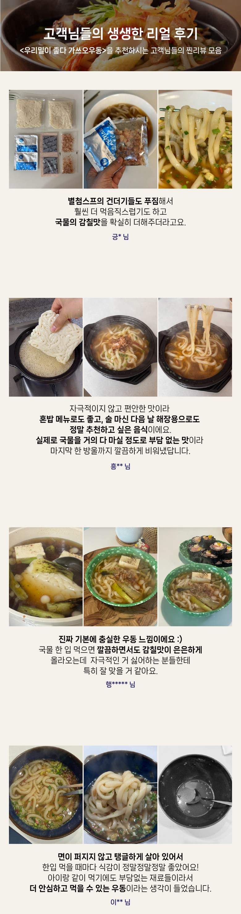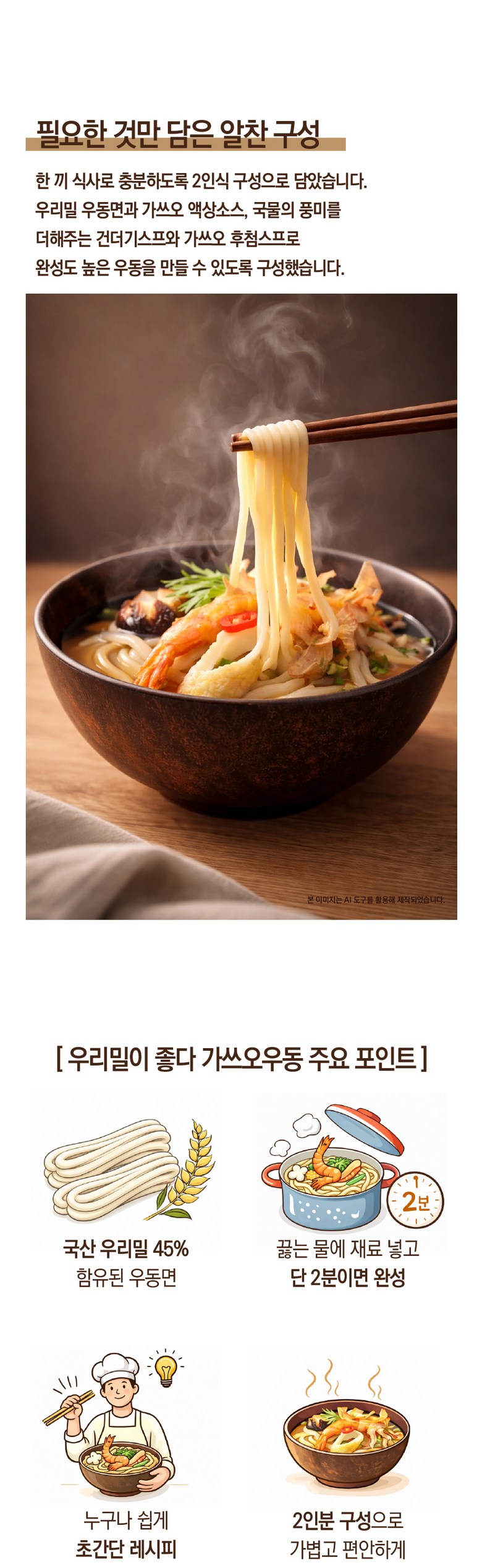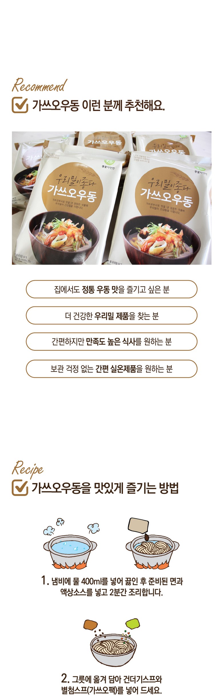| 포장단위별 내용물의 용량(중량), 수량 | 2인분입 468g | 원재료명 및 함량 | * 면 : 밀가루(밀:국산), 변성전분, 곡류가공품(프랑스산), 옥수수유(옥수수/외국산:러시아, 헝가리, 세르비아 등), 혼합제제(젖산, 젖산나트륨, 정제소금, 정제수), 정제소금, 포도씨유, 고구마전분, 쌀가루* 액상소스 : 가쓰오육수 35.51%{정제수, 가다랑어포2.91%(필리핀산)}, 설탕, 혼합간장{아미노산간장(탈지대두:인도산), 정제수, 정제소금(국산), 양조간장-HO6.3%(대두:인도산), 물엿, 카라멜색소}, 정제소금(국산), 가쓰오농축액7.1%{가쓰오부시후레이크30%(연근해산), 양조간장, L-글루탐산나트륨, 정제염, 글리신}. 함수결정포도당, 양조간장RO, 시즈닝베이스, 가쓰오조미액, 하나가쓰오GO, 조미림, 주정, 참치농축액, 이스톡* 건더기스프 : 별미튀김6호, 동결건조파, 건조맛살어묵, 건조링홍고추* 별첨스프 : 가쓰오팩 |