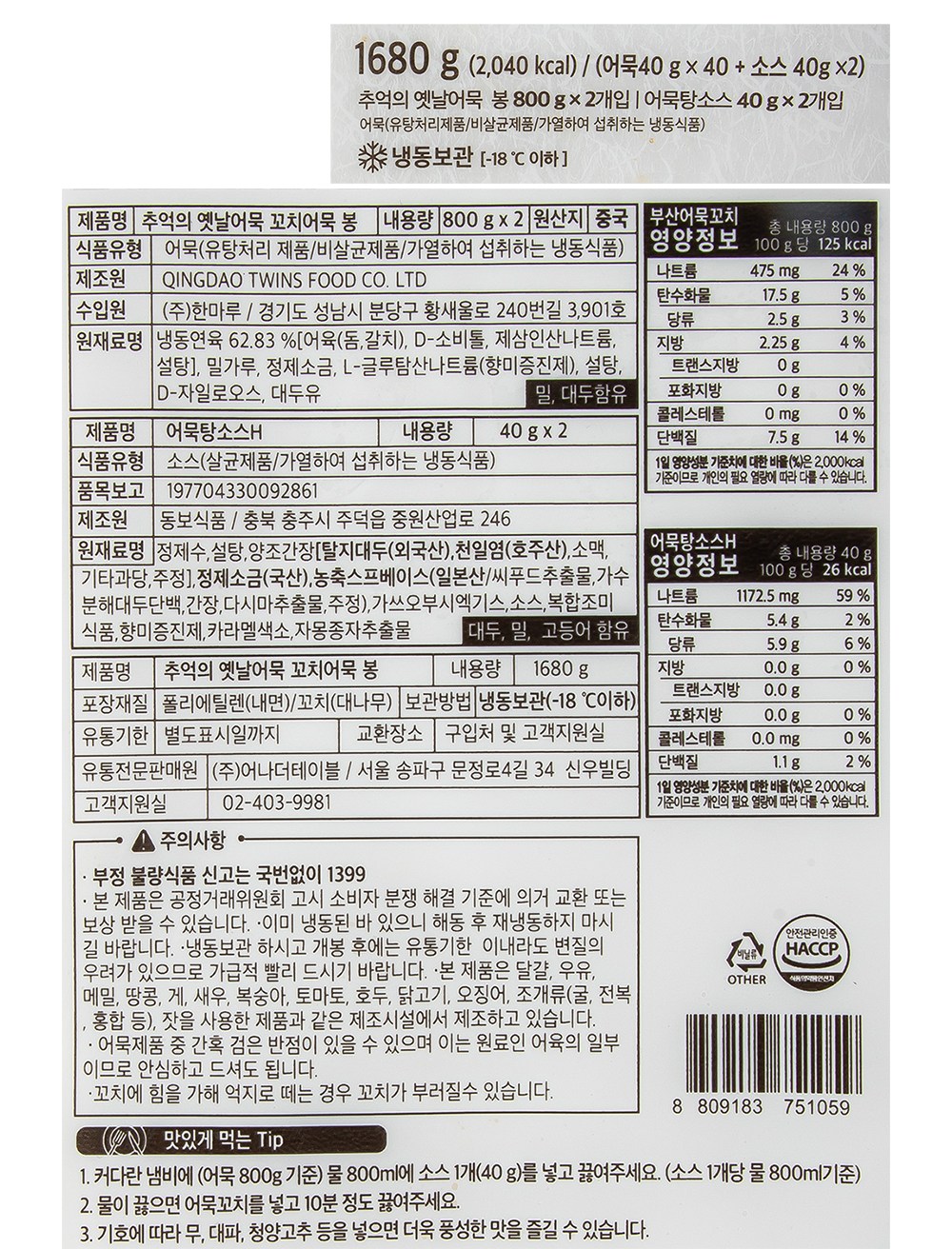 어묵탕, 어묵조림 등으로 활용 구성 정보
