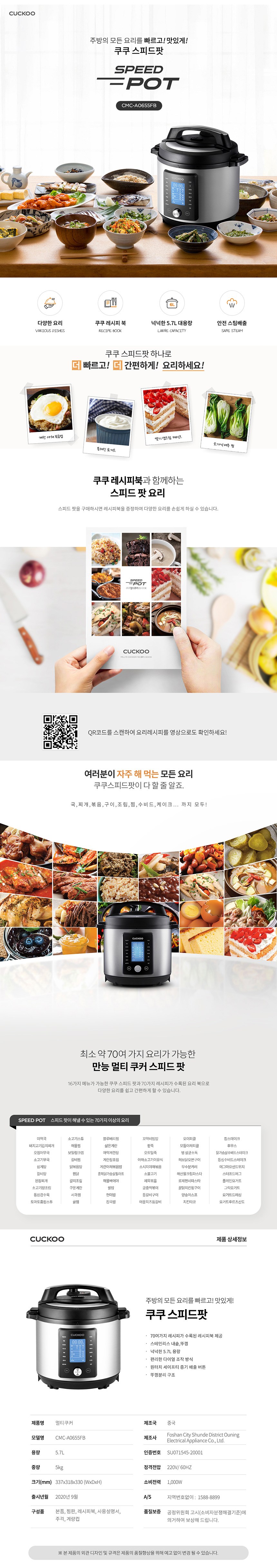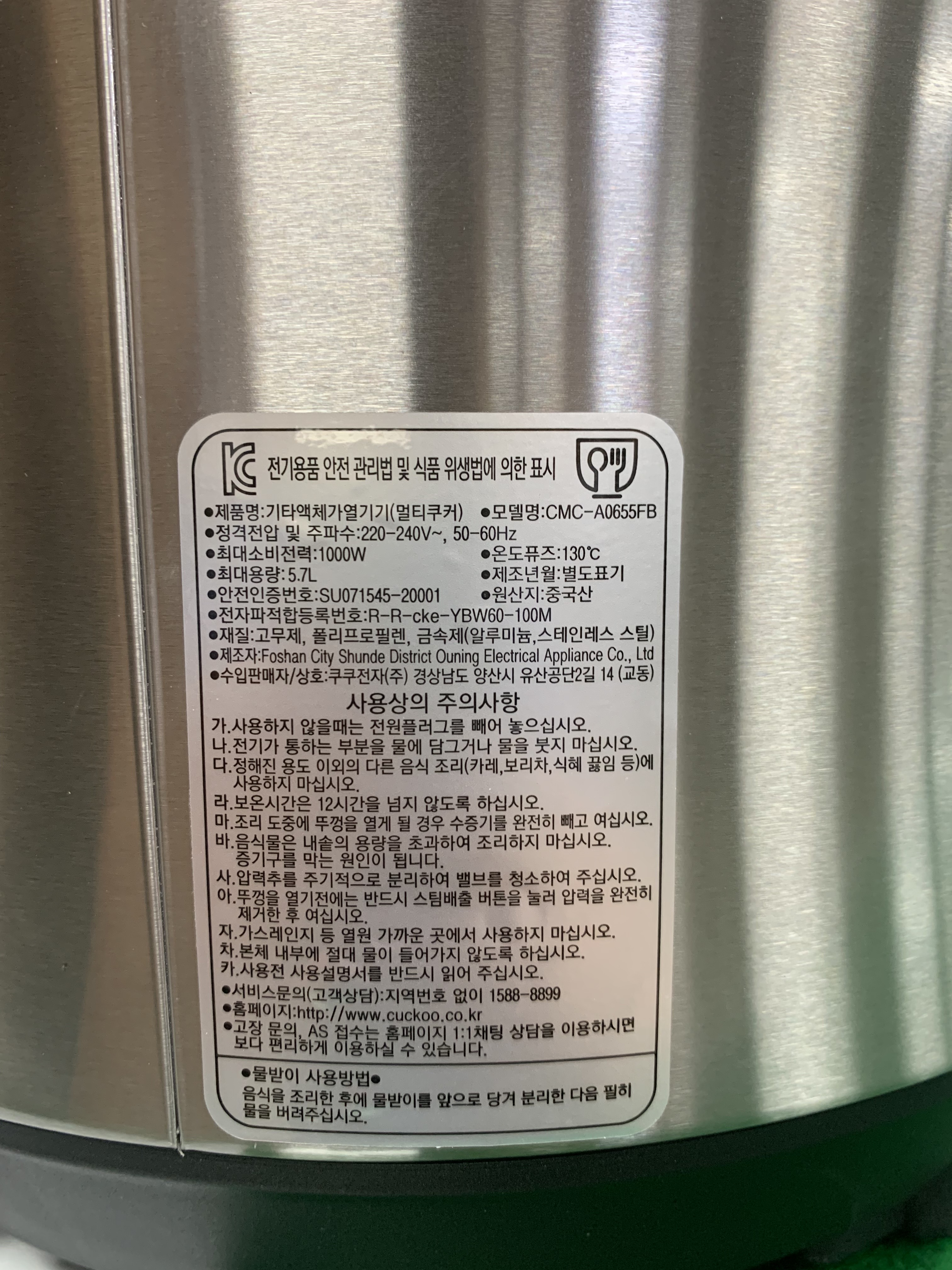 | 품명 및 모델명 | 쿠쿠 스피드팟 멀티쿠커 CMC-A0655FB | KC 인증정보 | SU071545-20001 / R-R-cke-YBW60-100M |