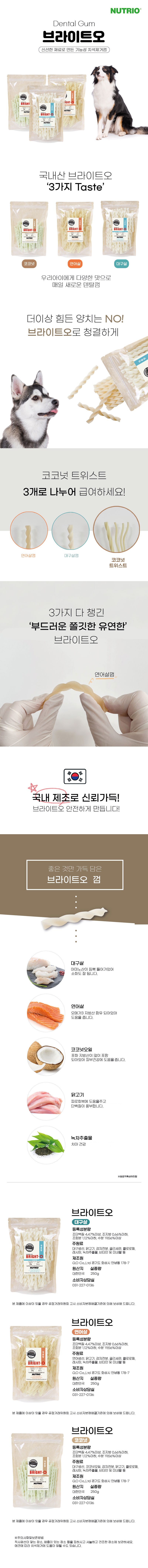 | 품명 및 모델명 | 뉴트리오 브라이트-오 대구살껌맛 250g | 인증/허가 사항 | 사료관리법에 따른 성분등록번호 : 컨텐츠 참조 |