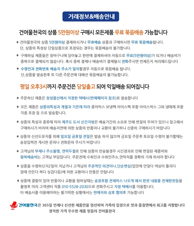 | 배송방법 | 신선/냉장/냉동 | 배송비 | 무료배송 · 도서산간 추가 배송비 - 제주 지역: 4,000원 - 도서산간 지역: 8,000원 |
