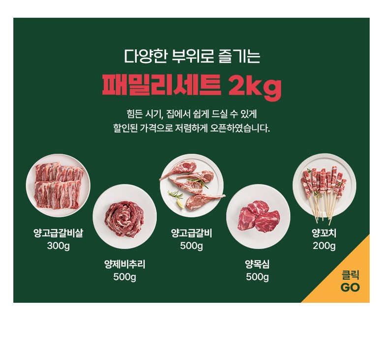 | 품목 또는 명칭 | 양고기 패밀리세트 5-7인분 2000g | 포장단위별 내용물의 용량(중량),수량,크기 | 양고급갈비500g 1팩양목심 500g 1팩양고급늑간살 500g 1팩양제비추리300g 1팩양꼬치200g 1팩총 5팩 2000g |
