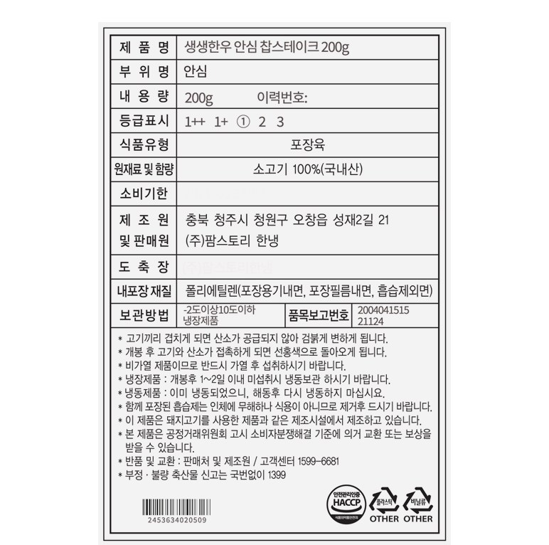 | 품목 또는 명칭 | 생생한우 안심 찹스테이크 200g | 포장단위별 내용물의 용량(중량),수량,크기 | 200g, 1개 |