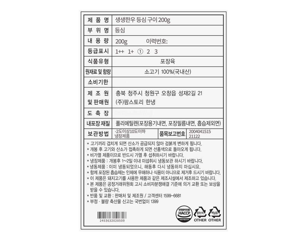 | 품목 또는 명칭 | 생생한우 등심 구이 200g | 포장단위별 내용물의 용량(중량),수량,크기 | 200g x 2개,1개 |