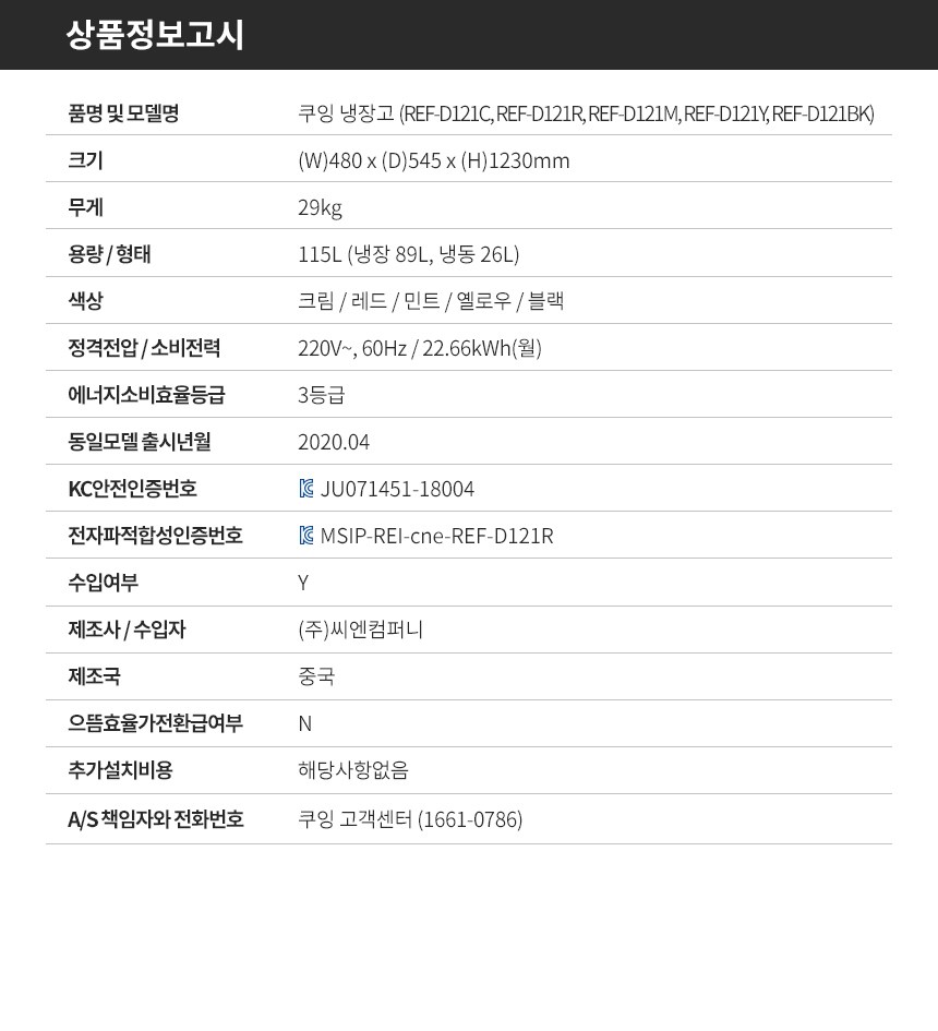 | 품명 및 모델명 | 전기냉장냉동기기(전기냉장고) /REF-D121R | KC 인증정보 | JU071451-18004 ,MSIP-REI-cne-REF-D121R |
