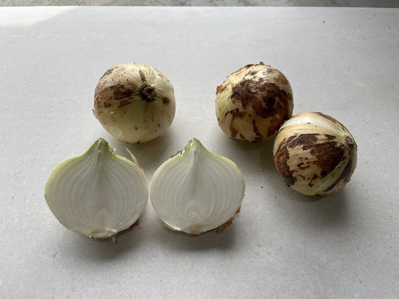 햇양파를 수확해서 줄기를 자르고 양파를 반을 갈라 보았습니다.