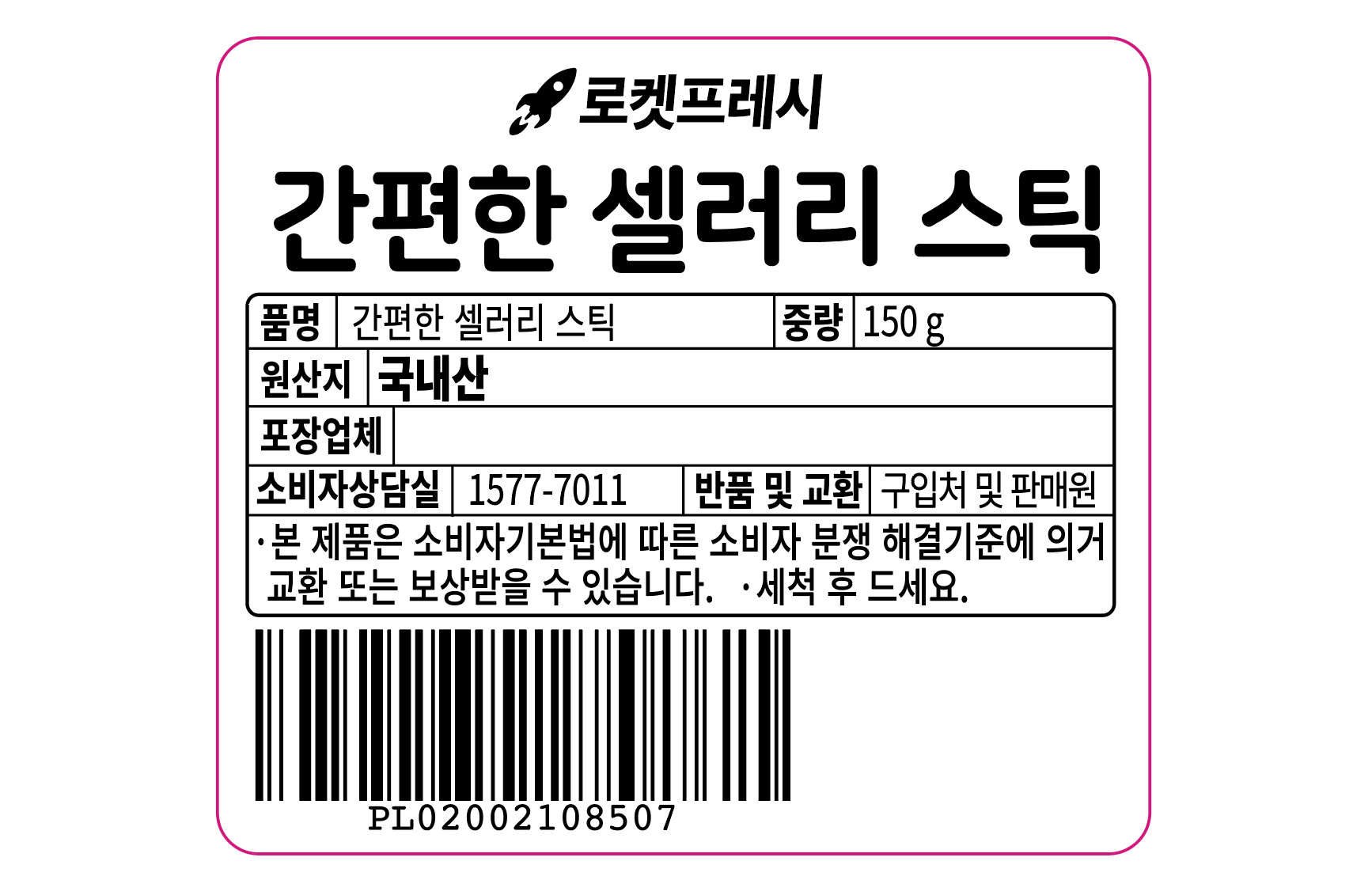 | 품목 또는 명칭 | 간편한 셀러리 스틱 | 포장단위별 내용물의 용량(중량),수량,크기 | 150gx1개 |