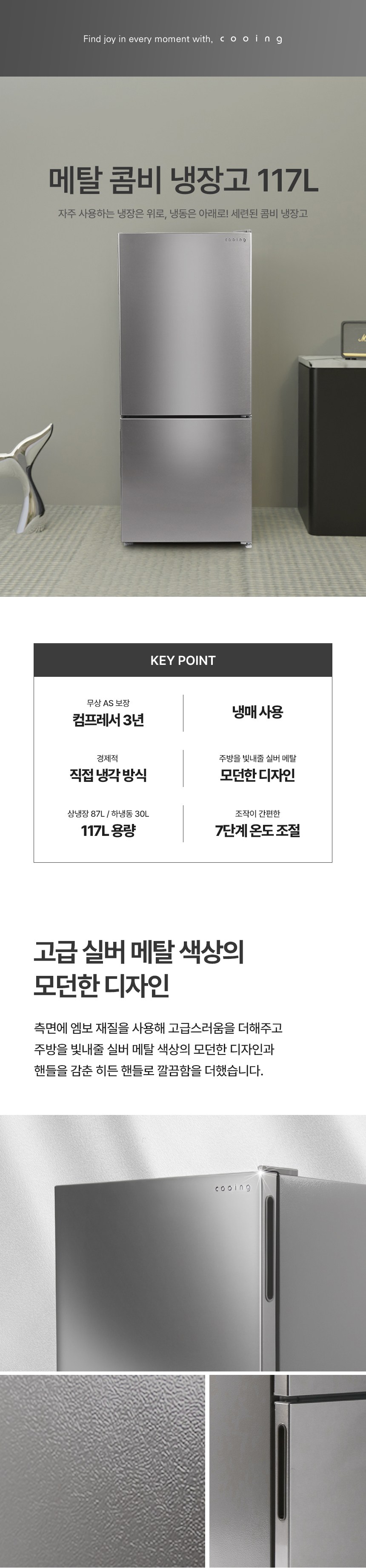| 품명 및 모델명 | 쿠잉전자 메탈슬림 콤비냉장고 / REF-C120S | KC 인증정보 | JU071242-20006, R-R-cne-BCD-117QK |