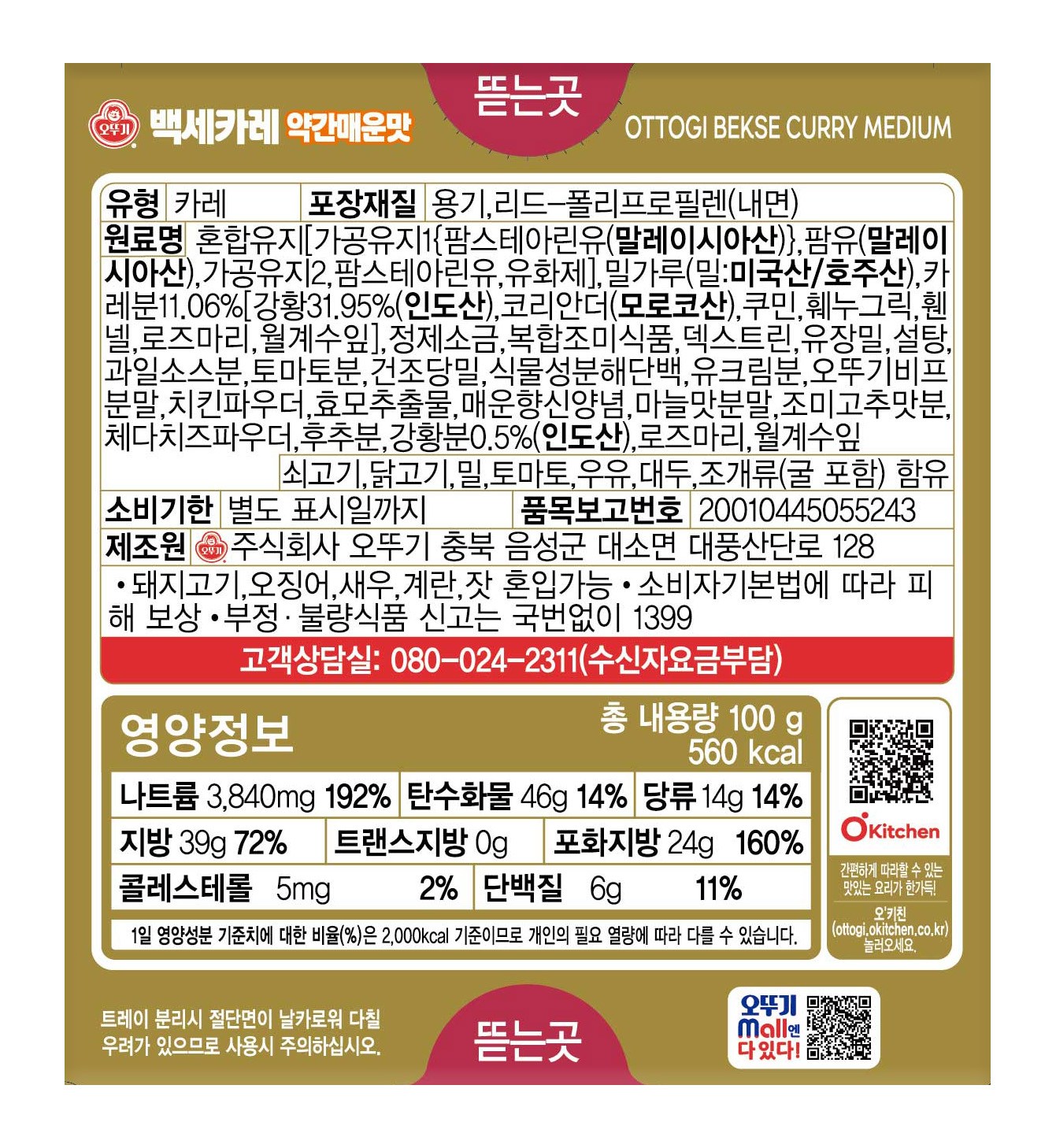 | 제품명 | 오뚜기 백세카레 약간매운맛 | 식품의 유형 | 컨텐츠 참조 |