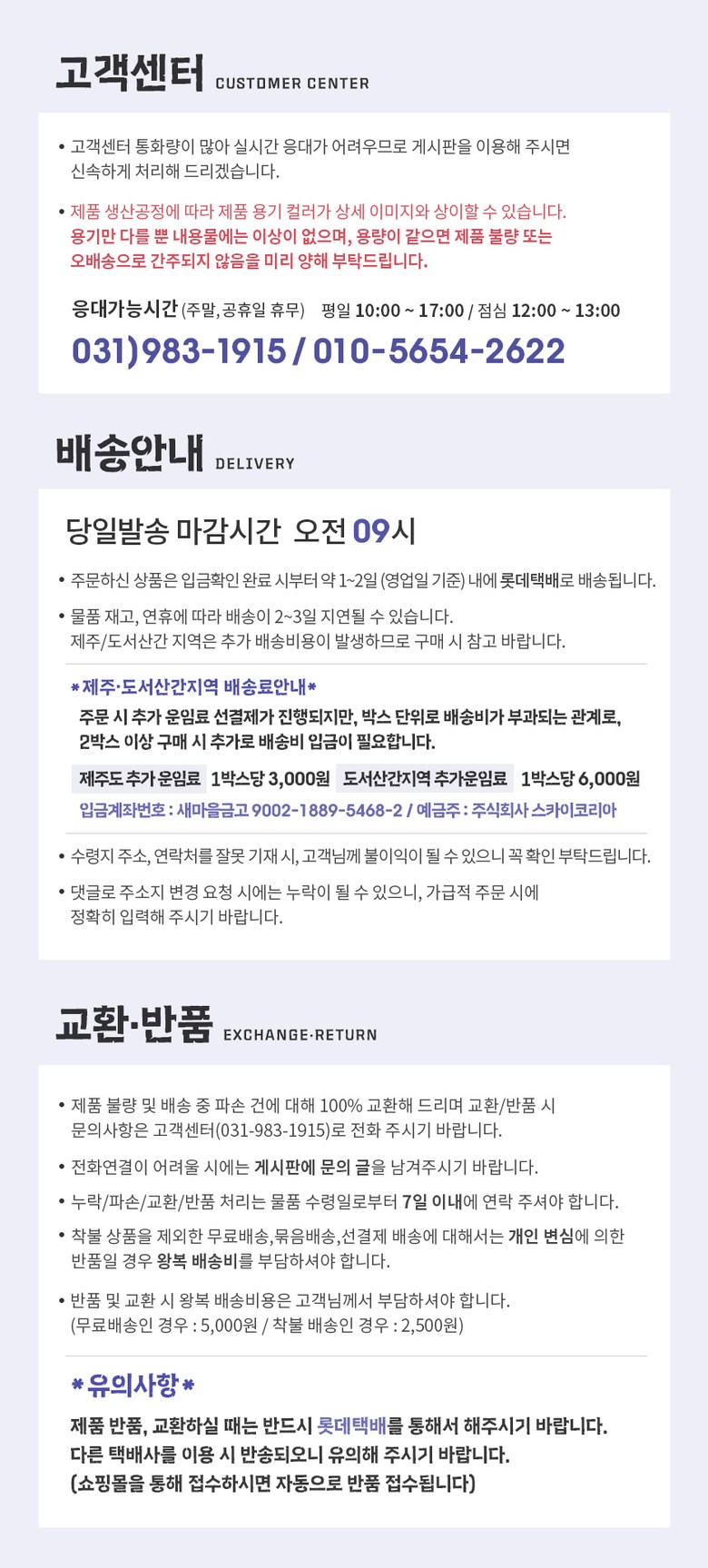 | 배송방법 | 순차배송 | 배송비 | 무료배송 · 도서산간 추가 배송비 - 제주 지역: 5,000원 - 도서산간 지역: 8,000원 |