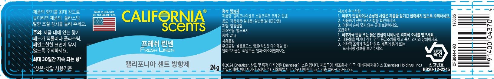 | 품목 및 제품명 | 방향제 / 캘리포니아센트 스필프루프 프레쉬 린넨 | 용도(표백제의 경우 계열을 함께표시) 및 제형 | 자동차용(실내용), 일반용(실내공간용) / 함침물형 |