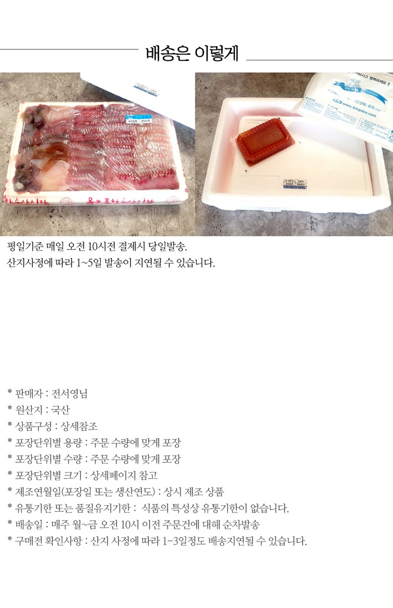 | 배송방법 | 신선/냉장/냉동 | 배송비 | 무료배송 - 도서산간 지역 배송불가 |