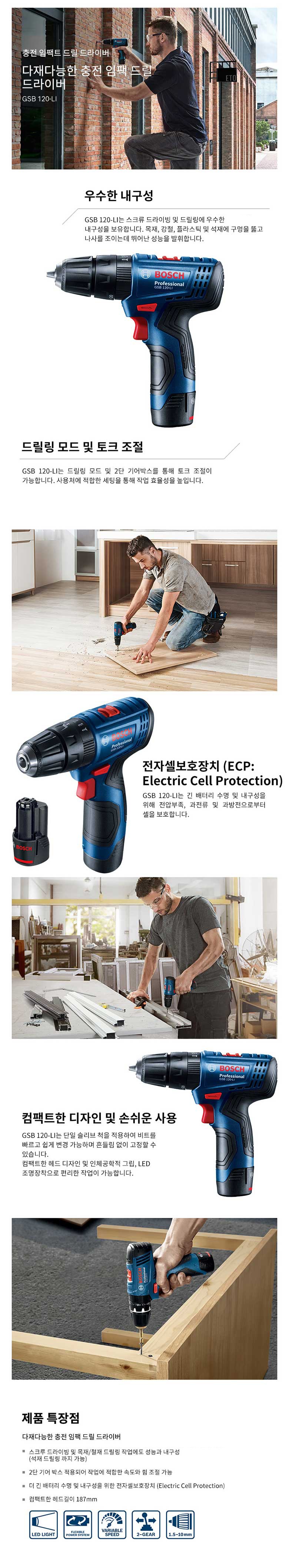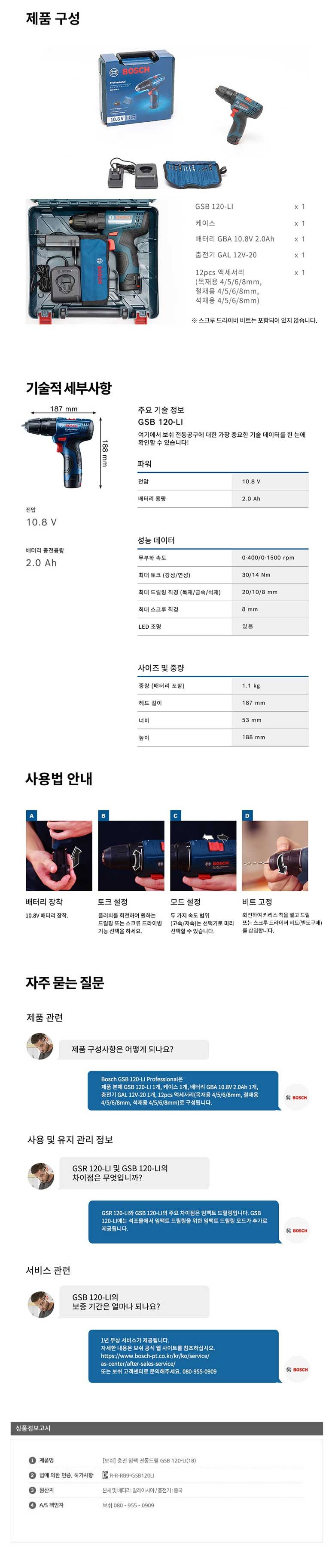 | 품명 및 모델명 | Cordless drill/driver / GSB 120-LI | KC 인증정보 | 리뉴얼 전: 본품 R-R-RB9-GSB120LI / 충전기 SU072184-18001B, R-R-RB9-GAL12V20 / 배터리 ZU10240-16002F | 리뉴얼 후: 본품 R-R-RB9-GSB120LI / 충전기 HU071045-21041A, R-R-RB9-GAL12V20 / 배터리 ZU10240-24001C |