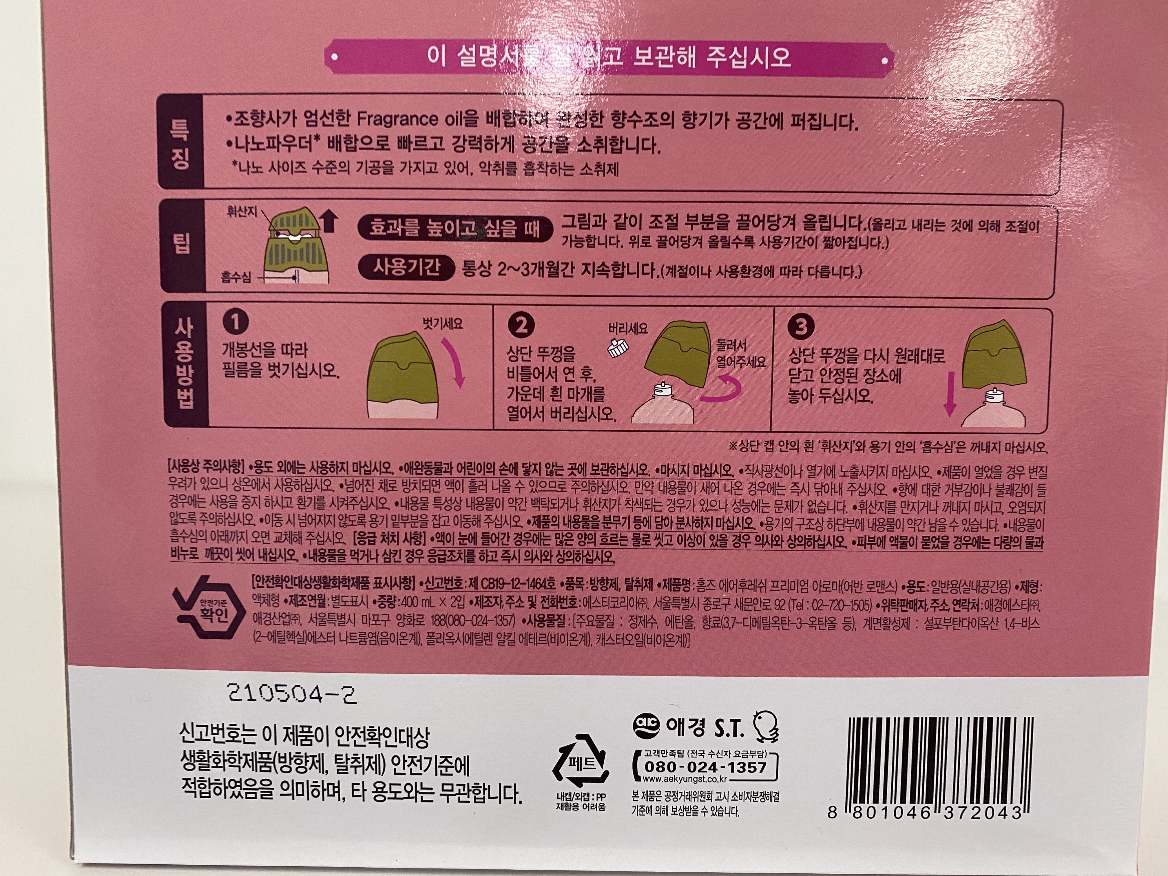 | 품목 및 제품명 | 방향제,탈취제 / 홈즈 에어후레쉬 프리미엄 아로마(어반 로맨스) | 용도(표백제의 경우 계열을 함께표시) 및 제형 | 일반용-실내공간용- |