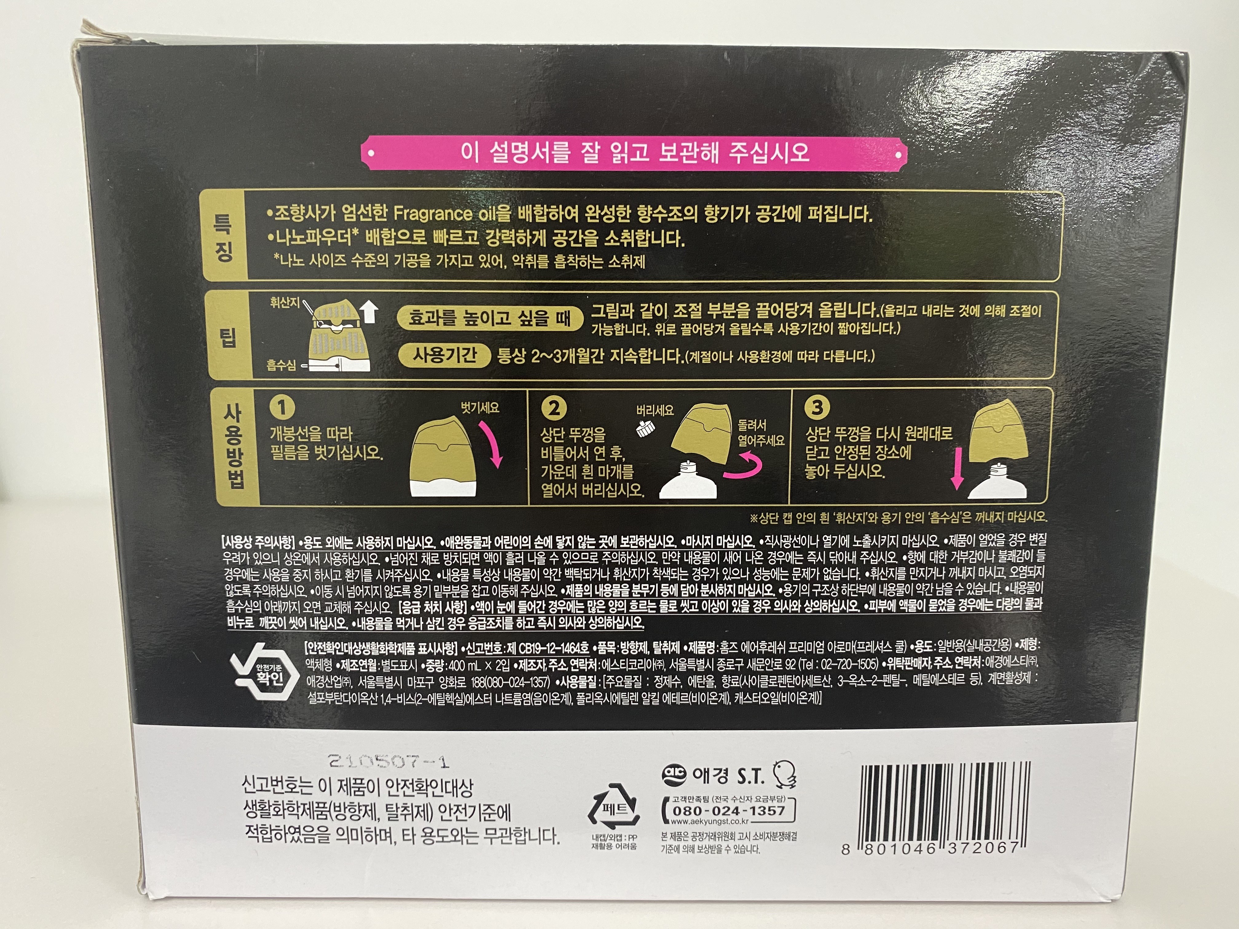 | 품목 및 제품명 | 방향제,탈취제 / 홈즈 에어후레쉬 프리미엄 아로마(프레셔스 쿨) | 용도(표백제의 경우 계열을 함께표시) 및 제형 | 일반용-실내공간용- |