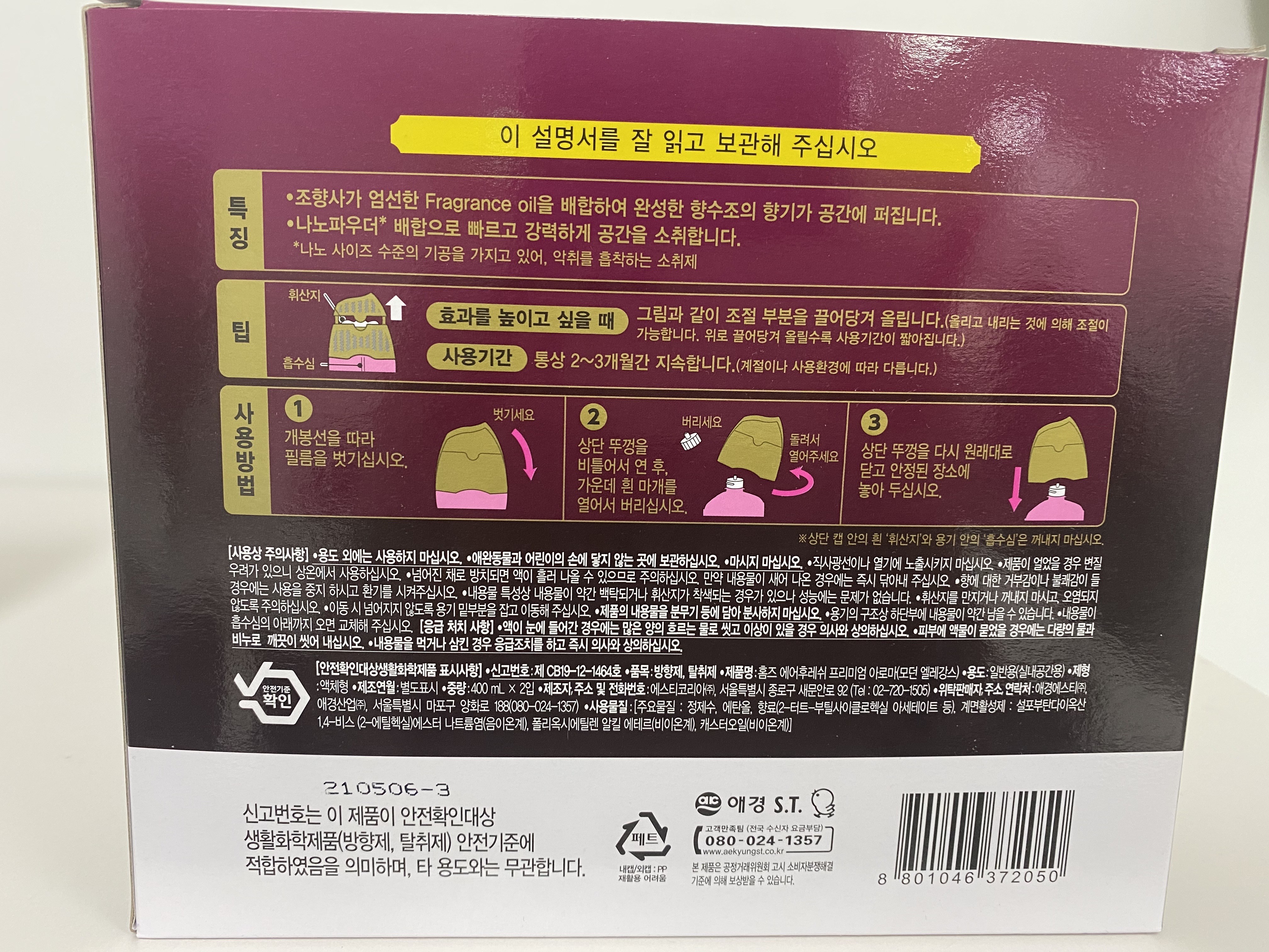 | 품목 및 제품명 | 방향제,탈취제 / 홈즈 에어후레쉬 프리미엄 아로마(모던 엘레강스) | 용도(표백제의 경우 계열을 함께표시) 및 제형 | 일반용-실내공간용- |