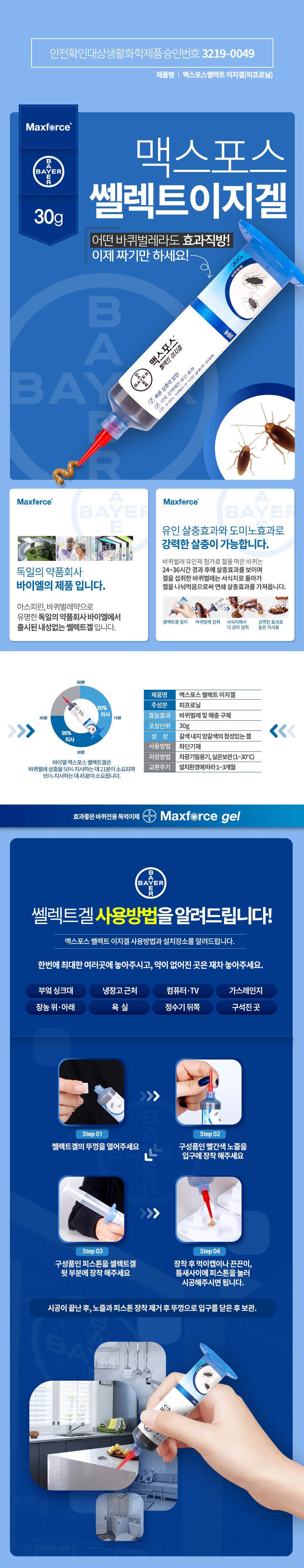 | 품목 및 제품명 | 보건용 살충제 / 맥스포스쎌렉트이지겔(피프로닐) | 유통기한 | 유통기한 : 2026년 06월 04일 이거나 그 이후인 상품 |