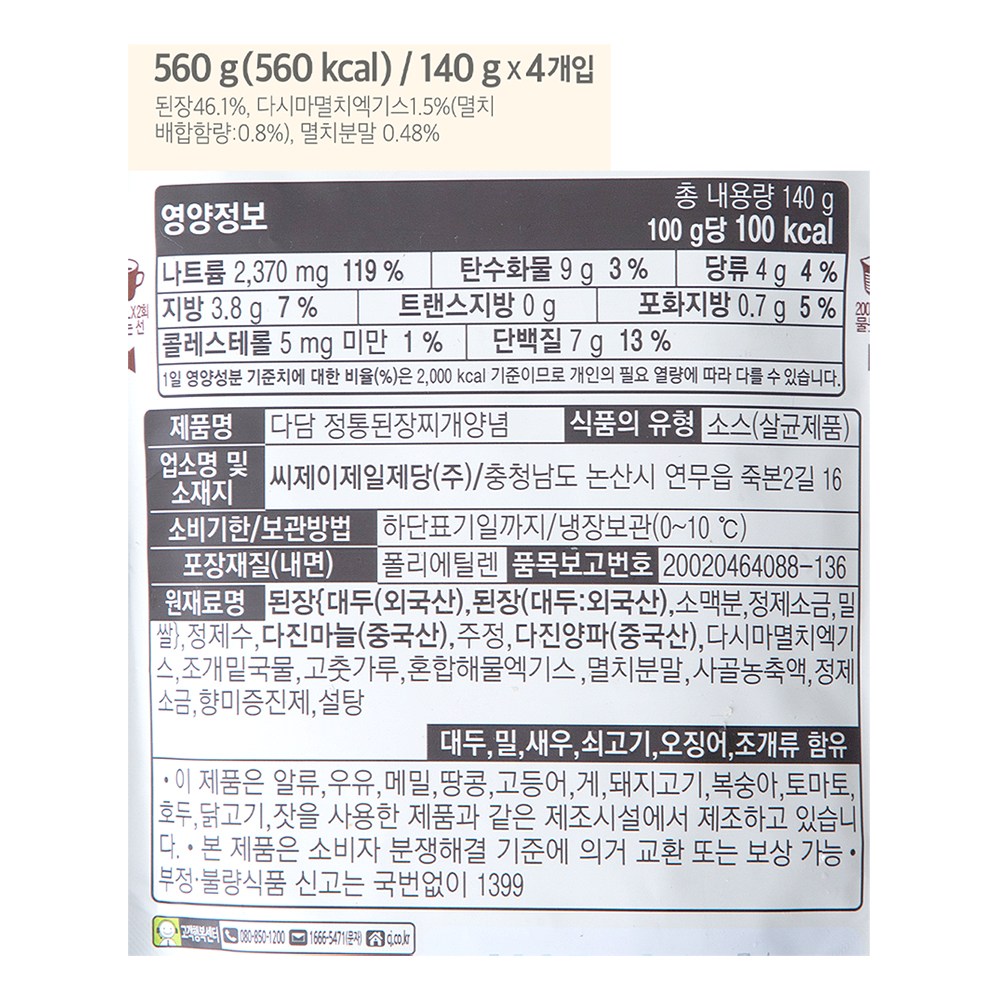 구수한 풍미를 자랑하는 된장찌개 양념이에요. 직접 재료를 준비하고 간을 맞출 필요가 없어 간편하죠. 맛이 진하고 깊어, 특별한 기술 없이도 맛있는 요리를 만들 수 있답니다. 두부, 채소 등을 준비해, 입맛 돋우는 된장찌개를 끓여보세요.