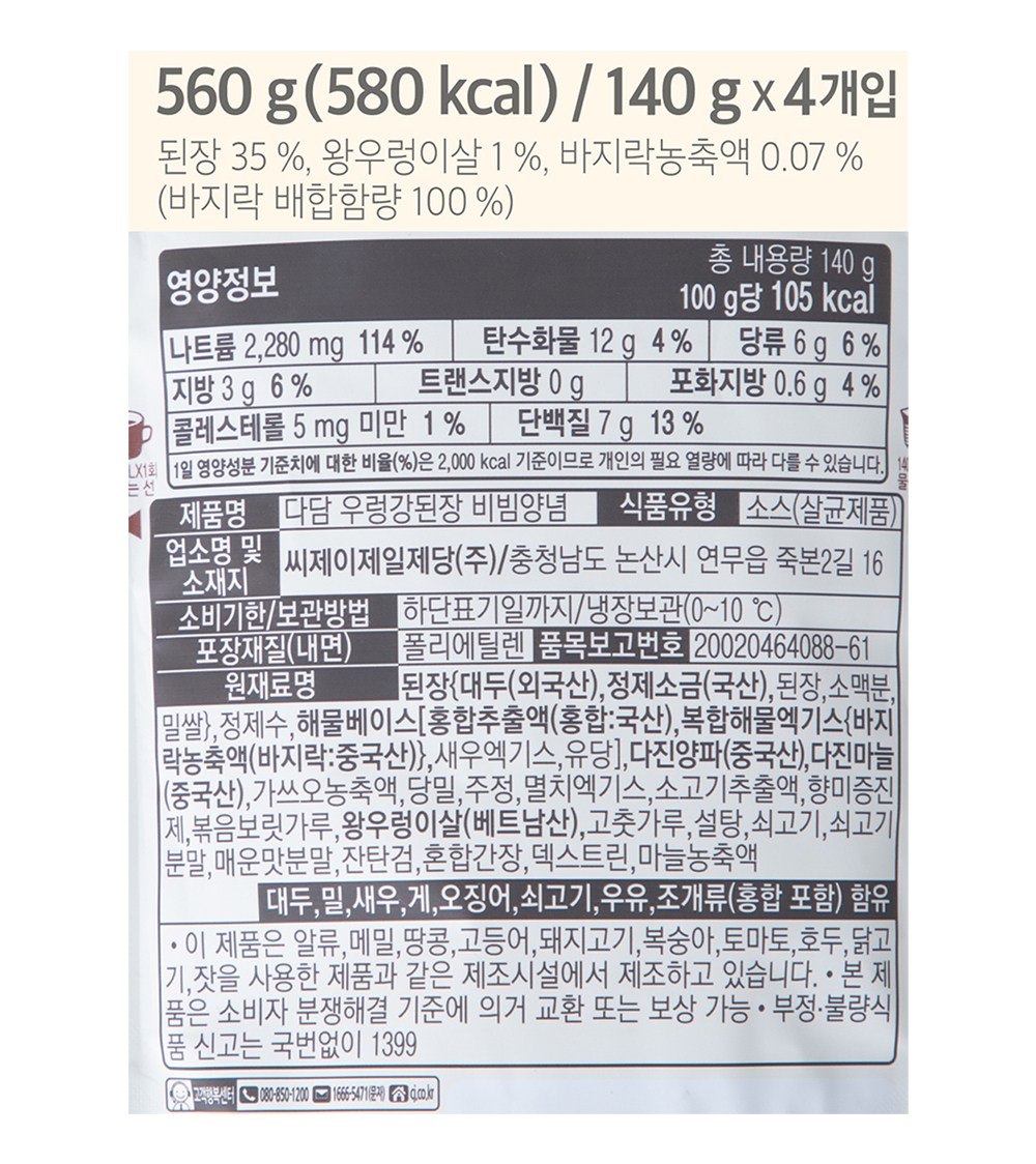 | 포장단위별 내용물의 용량(중량), 수량 | 140g*4개 | 원재료명 및 함량 | 컨텐츠참조 |