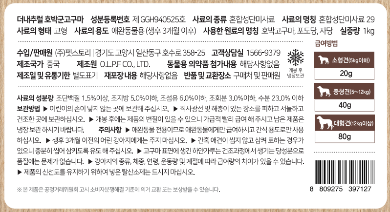 | 품명 및 모델명 | 더내추럴 강아지 호박 군고구마스틱 1kg | 인증사항 | 해당없음 |