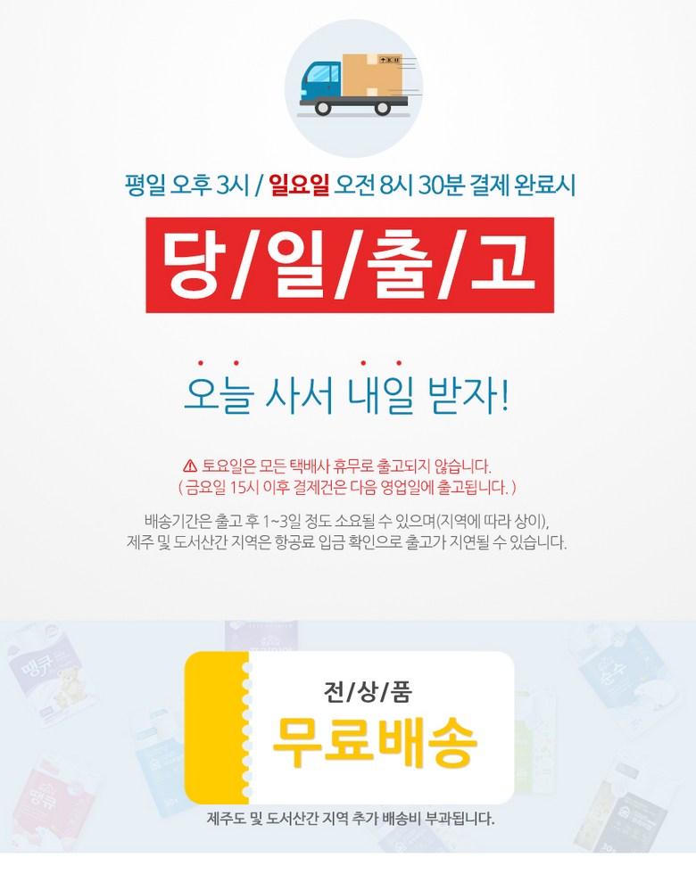 | 배송방법 | 순차배송 | 배송비 | 무료배송 - 도서산간 지역 배송불가 |