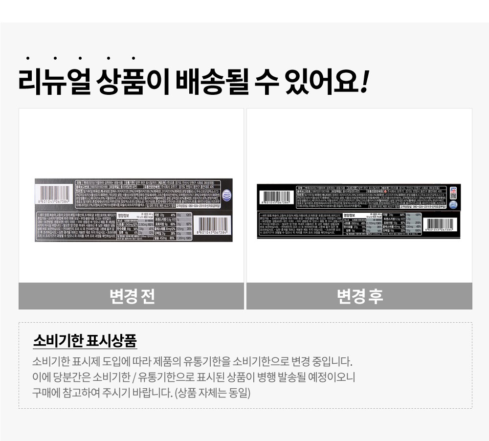 | 생산자 및 소재지 | 컨텐츠참조 | 소비기한 또는 품질유지기한 | 소비기한(또는 유통기한) : 2026년 07월 29일 이거나 그 이후인 상품 |