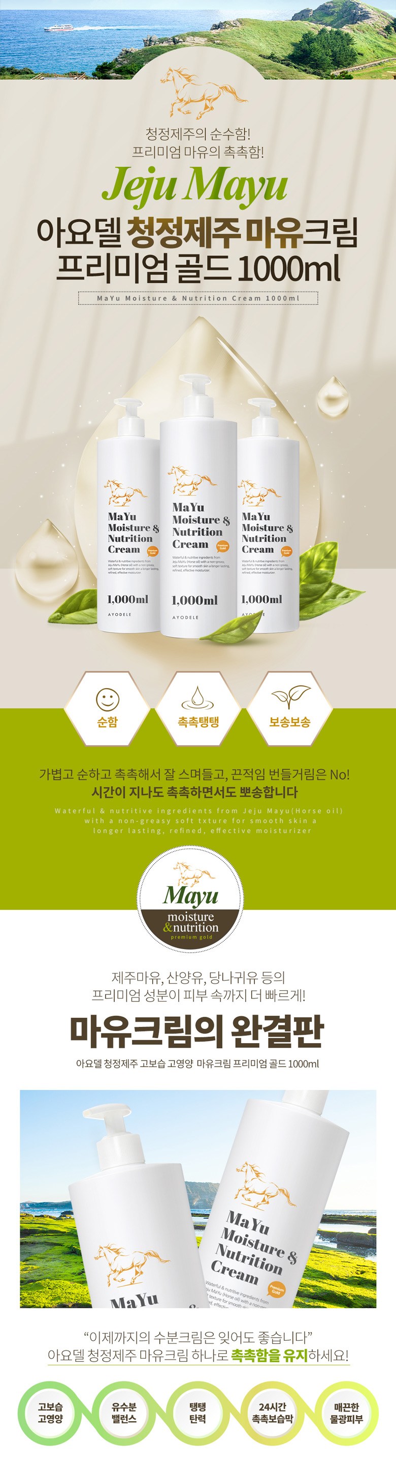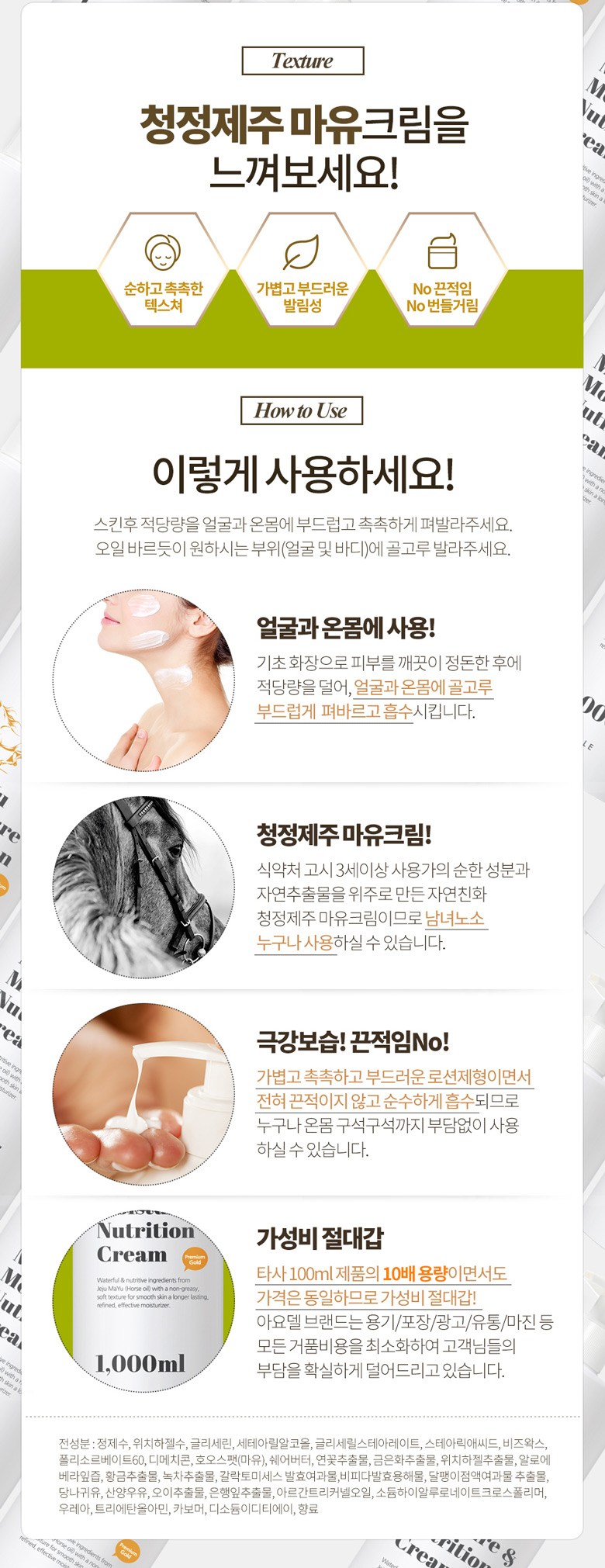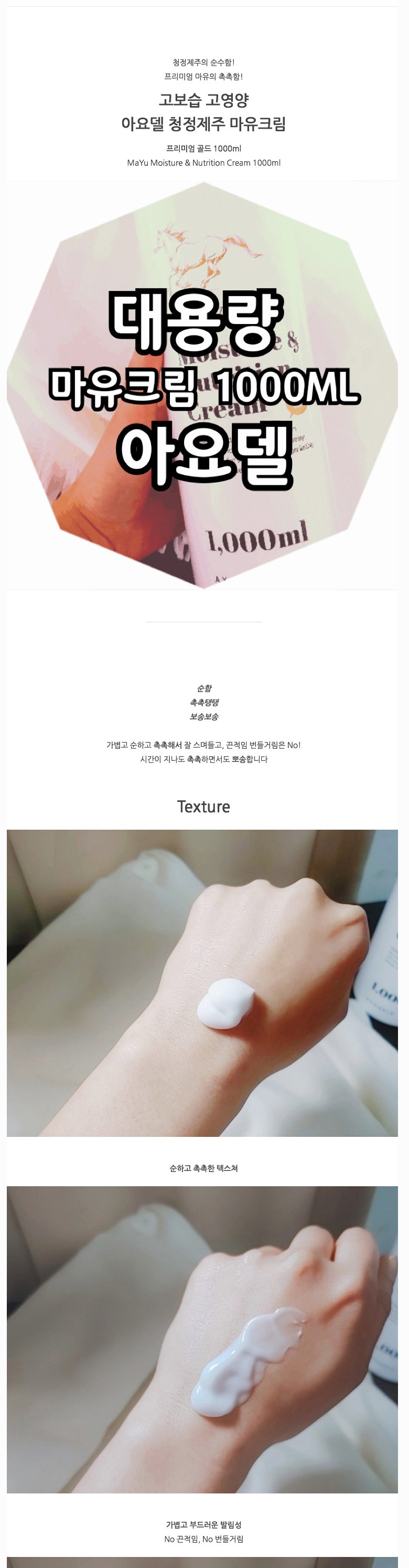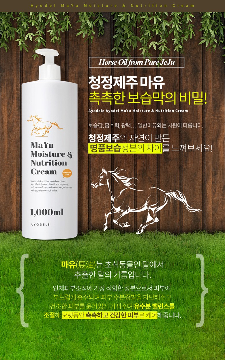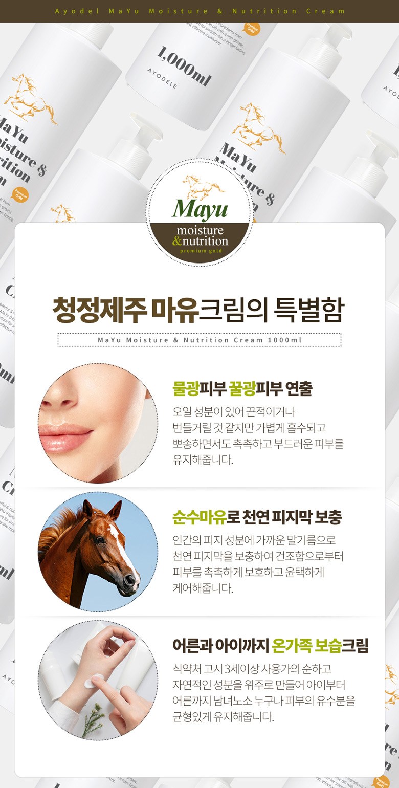 | 용량(중량) | 아요델 청정제주 고보습 고영양 마유크림 1,000ml | 제품 주요 사양 | 모든 피부용 / 순한 자연성분 |